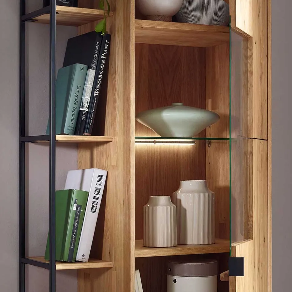In der Produktion des Hängeschranks mit Regal Varzado wird Wildeiche Massivholz mit schwarzem Metall und Glas kombiniert. Die Wildeiche kommt dabei sowohl in Form von durchgehenden Lamellen (Front) als auch in Parkettverleimung (Korpus) sowie als Furnier (Rückwand) zum Einsatz. Zum Schutz und zur Hervorhebung der reizvollen Maserung sowie Färbung der Wildeiche sind die Holzoberflächen natürlich geölt. Der Rahmen (ca. 1,5 cm stark) des Regals sowie der dezent gestaltete Metallgriff des Hängeschrankes bestehen aus schwarzem Metall.