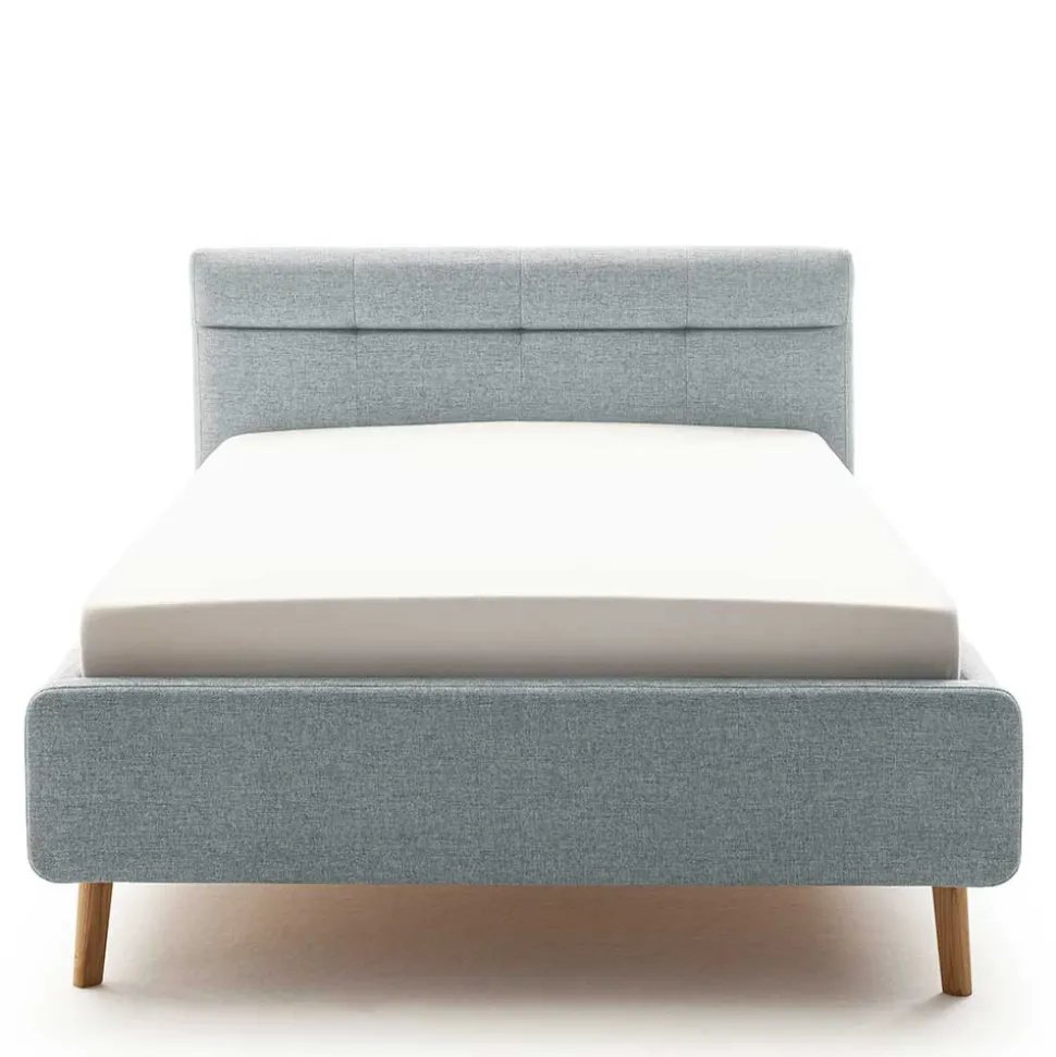 - Pastelliges Polsterbett in Hellblau und Eichefarben