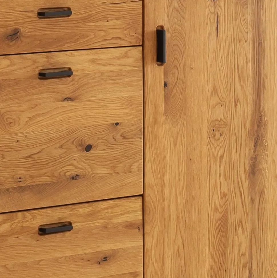 Das Highboard „Robats“ bringt rustikalen Charme und durchdachte Funktionalität in Ihr Zuhause. Mit seiner Front aus Balkeneiche Massivholz und dem Korpus aus Spanplatte mit Wildeiche Furnier strahlt es eine hochwertige, warme Ästhetik aus. Die geölten Oberflächen betonen die natürliche Holzstruktur und verleihen dem Möbelstück eine edle und lebendige Ausstrahlung.