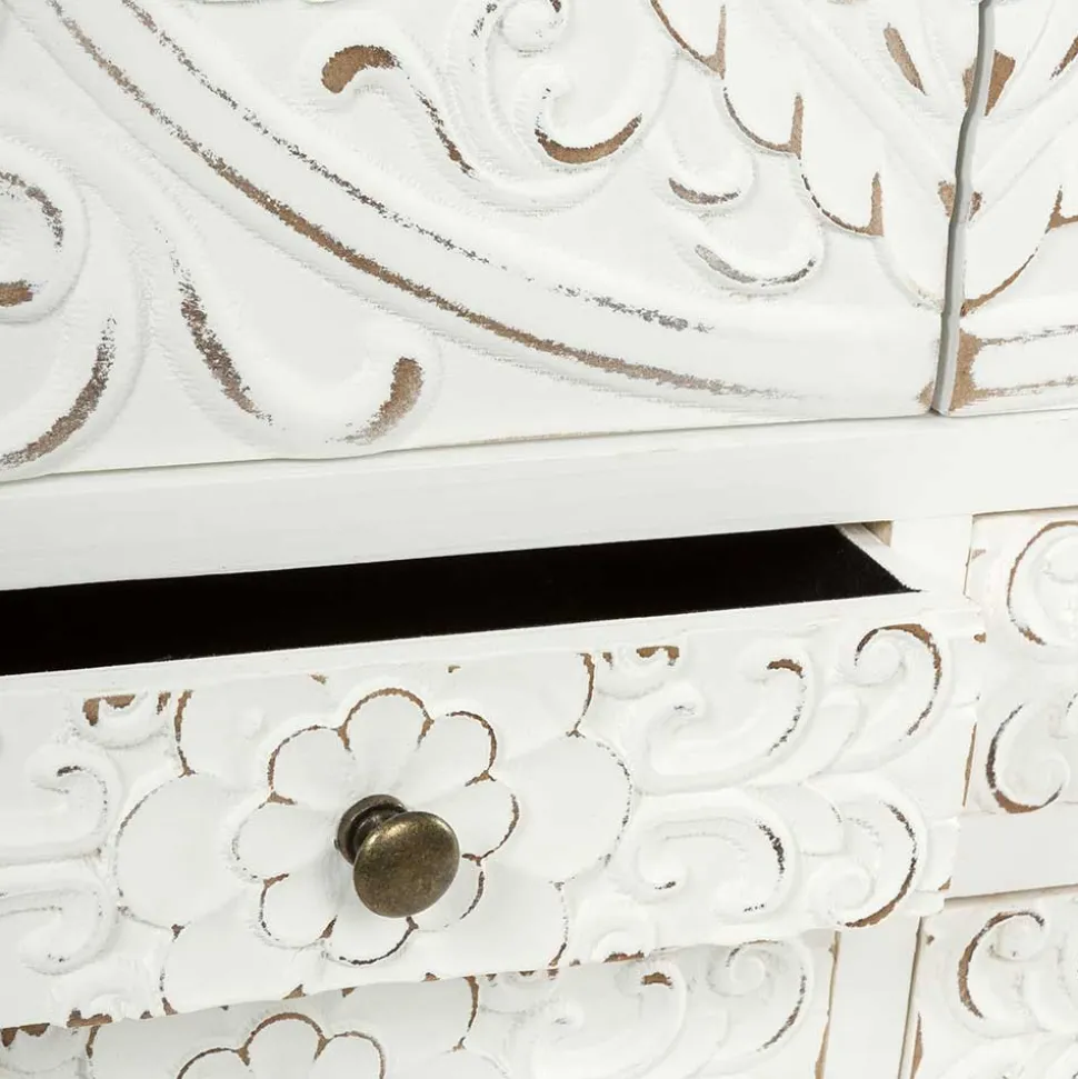 Tauchen Sie ein in die zauberhafte Welt des Orients! Mit dem Highboard Acacio holen Sie sich ein Möbelstück ins Haus, das mit seiner einzigartigen Mischung aus Eleganz und Exotik einen echten Blickfang darstellt. Die kunstvollen Ornamentmuster in goldenen Nuancen und die antikweißen, gewischten Holzoberflächen verleihen diesem Highboard seinen unverwechselbaren Charme. Ob als Stauraumwunder oder stilvolles Highlight – Acacio ist die perfekte Ergänzung für Ihr Zuhause.