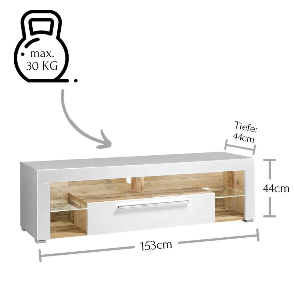 Mit seinen großzügigen Maßen von 153 cm Breite, 44 cm Höhe und 44 cm Tiefe bietet das TV-Board „Wouty“ ausreichend Platz für Ihren Fernseher und sämtliches Zubehör. Die durchdachte Aufteilung ermöglicht eine ordentliche Unterbringung von Mediengeräten und Accessoires. Die mittige Klappe mit Gasdruckdämpfern öffnet sich sanft und mühelos, während vier offene Gerätefächer und zwei seitliche Glasböden für eine übersichtliche Organisation sorgen. Eine Öffnung in der Rückwand dient als praktischer Kabeldurchlass, um lästiges Kabelgewirr zu vermeiden.