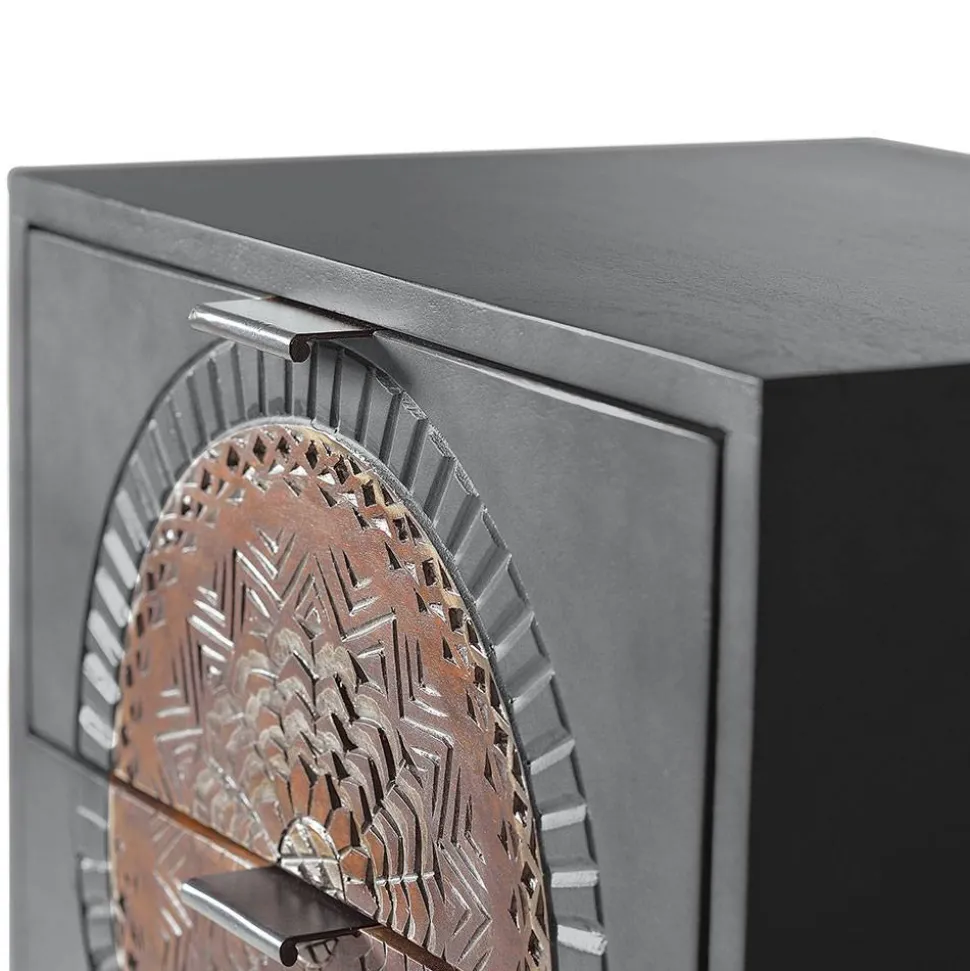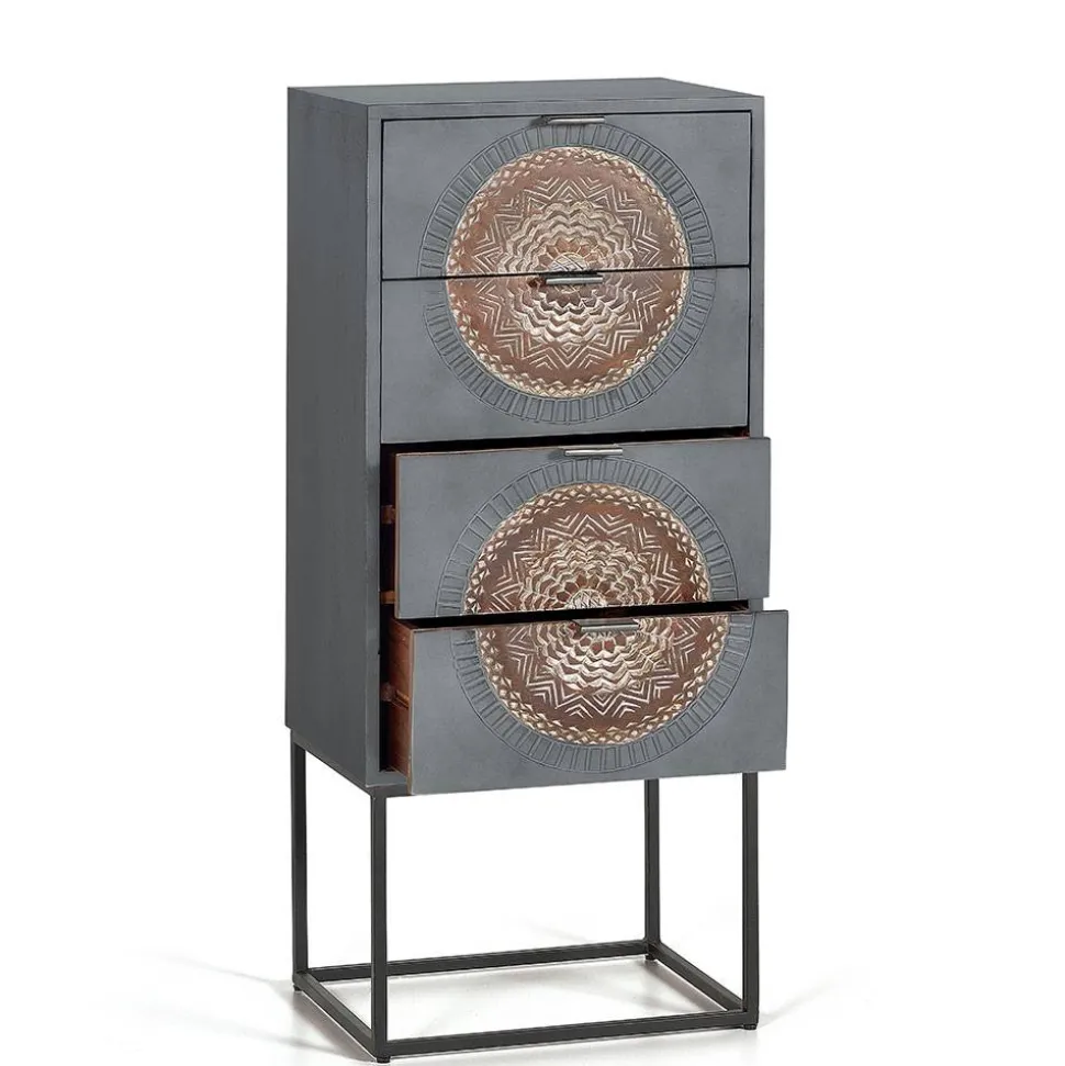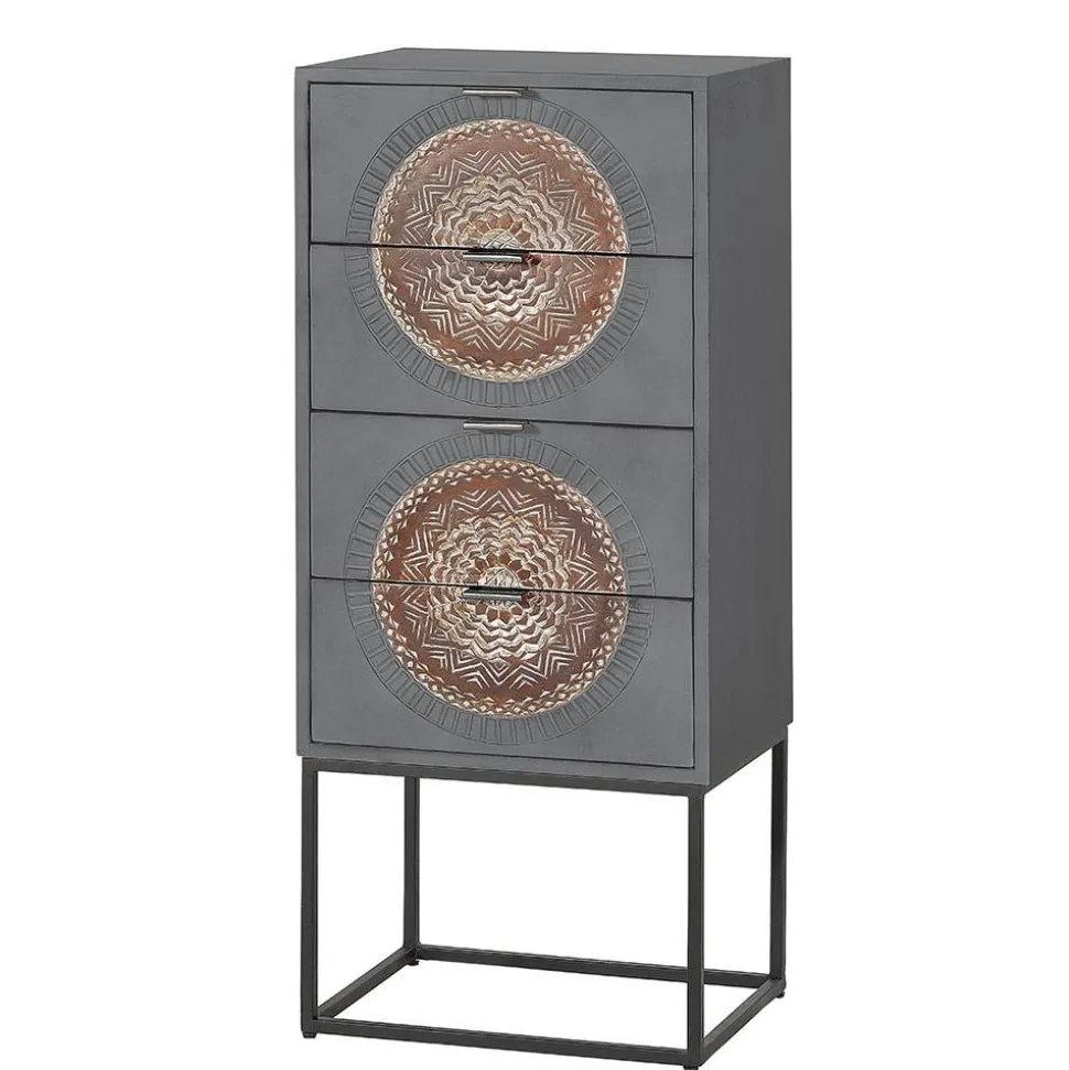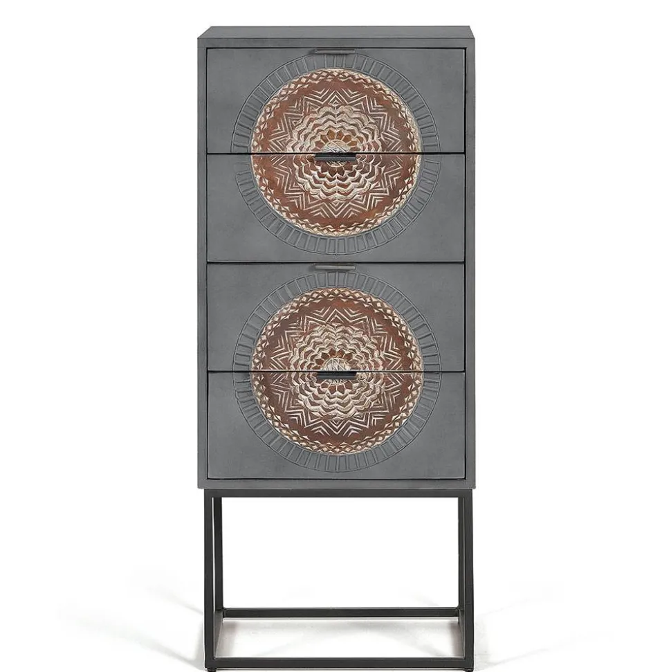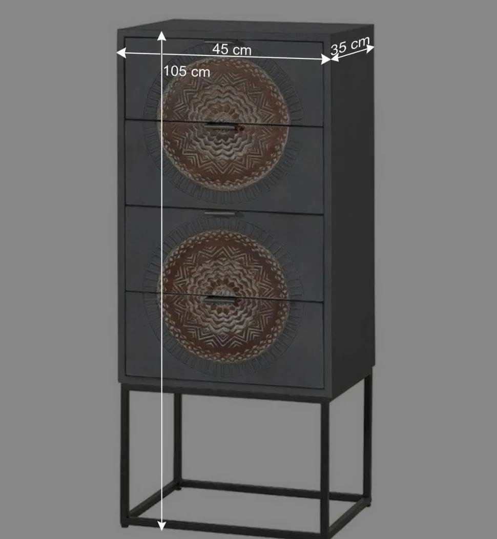 Die Hochkommode „Mesusco“ wird aus massivem Mangoholz gefertigt, einem langlebigen und nachhaltigen Naturmaterial. Die lackierten Holzoberflächen sind aufwendig von Hand bemalt und mit kunstvollen Schnitzereien versehen, die faszinierende Mandala-Motive zum Vorschein bringen. Das stabile Bügelgestell aus schwarzem Metall sorgt für eine sichere Standfestigkeit und harmoniert perfekt mit den dezenten Metall-Kantengriffen, die das Öffnen der Schubladen erleichtern.