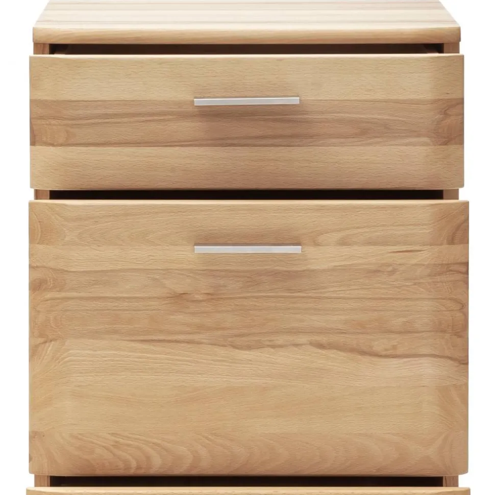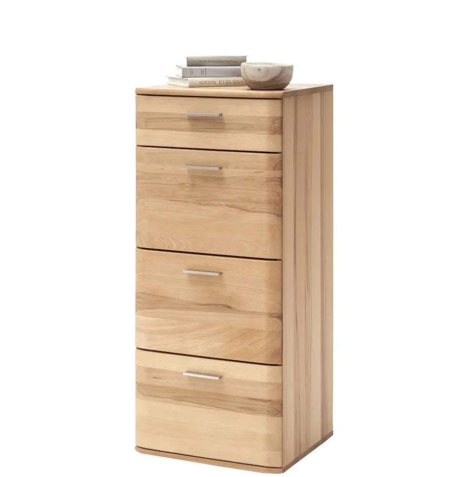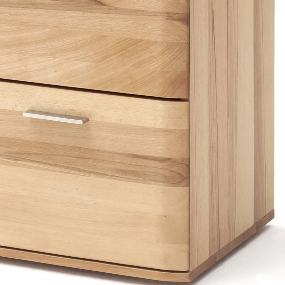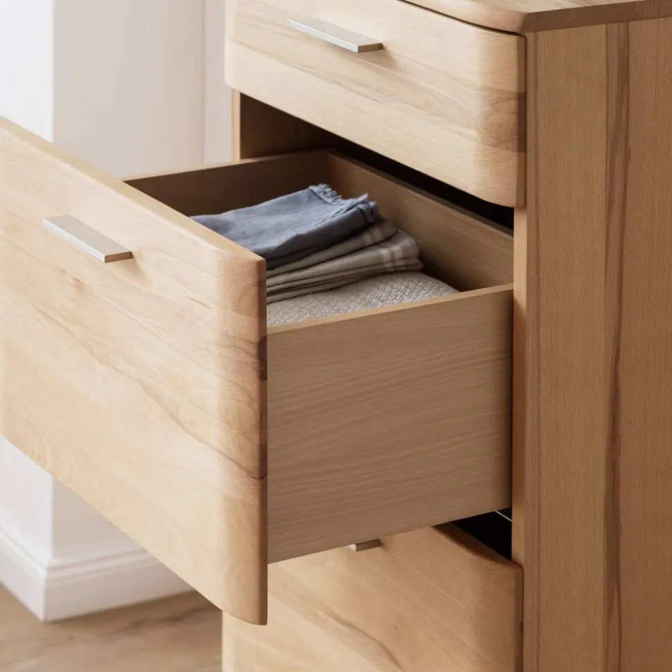 Die Hochkommode ist teilmassiv gearbeitet: Die Fronten bestehen aus Kernbuche Massivholz mit einer klaren, warmen Maserung, während der Korpus aus robusten Spanplatten gefertigt und mit Echtholzfurnier in Kernbuche versehen wurde. Die geölten Holzoberflächen unterstreichen die natürliche Optik und sind pflegeleicht. Silberfarbene Metallgriffleisten sorgen für einen modernen Akzent, während flache Holzfüße für sicheren Stand sorgen. Für zusätzliche Stabilität sind Ober- und Unterboden vorne mit massiven Anleimern versehen.