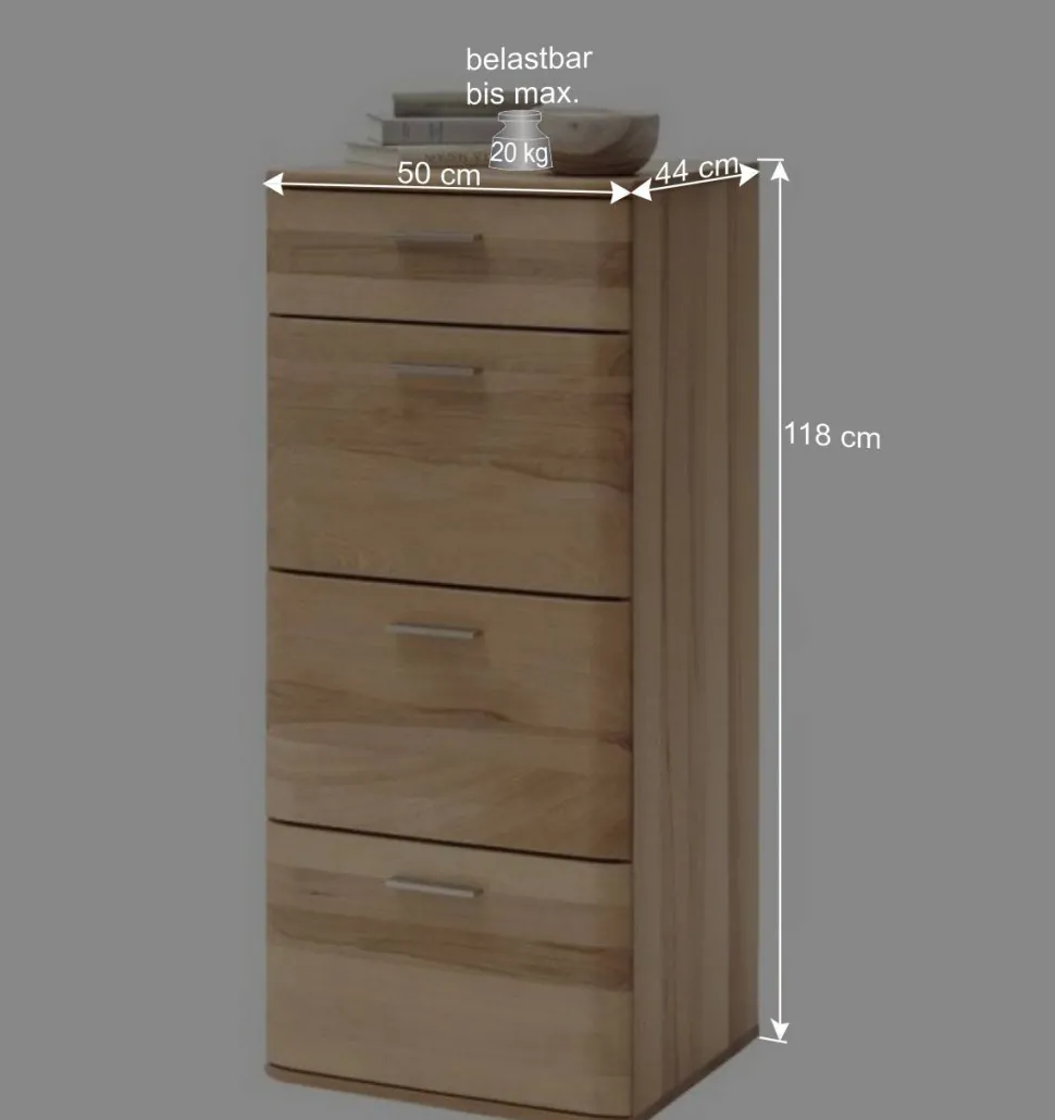 Vier großzügige Schubkästen mit Metall-Unterflurauszügen und Soft-Close-Funktion bieten Ihnen komfortablen Zugriff auf Ihre Utensilien. Mit den Innenmaßen von ca. 42 x 10/19 x 32 cm finden hier Kleidung, Dokumente oder andere persönliche Gegenstände ihren Platz. Die Deckplatte ist bis zu 20 kg belastbar und kann mit dekorativen Objekten stilvoll ergänzt werden. Für mehr Sicherheit im Alltag wird eine Kippsicherung mitgeliefert.