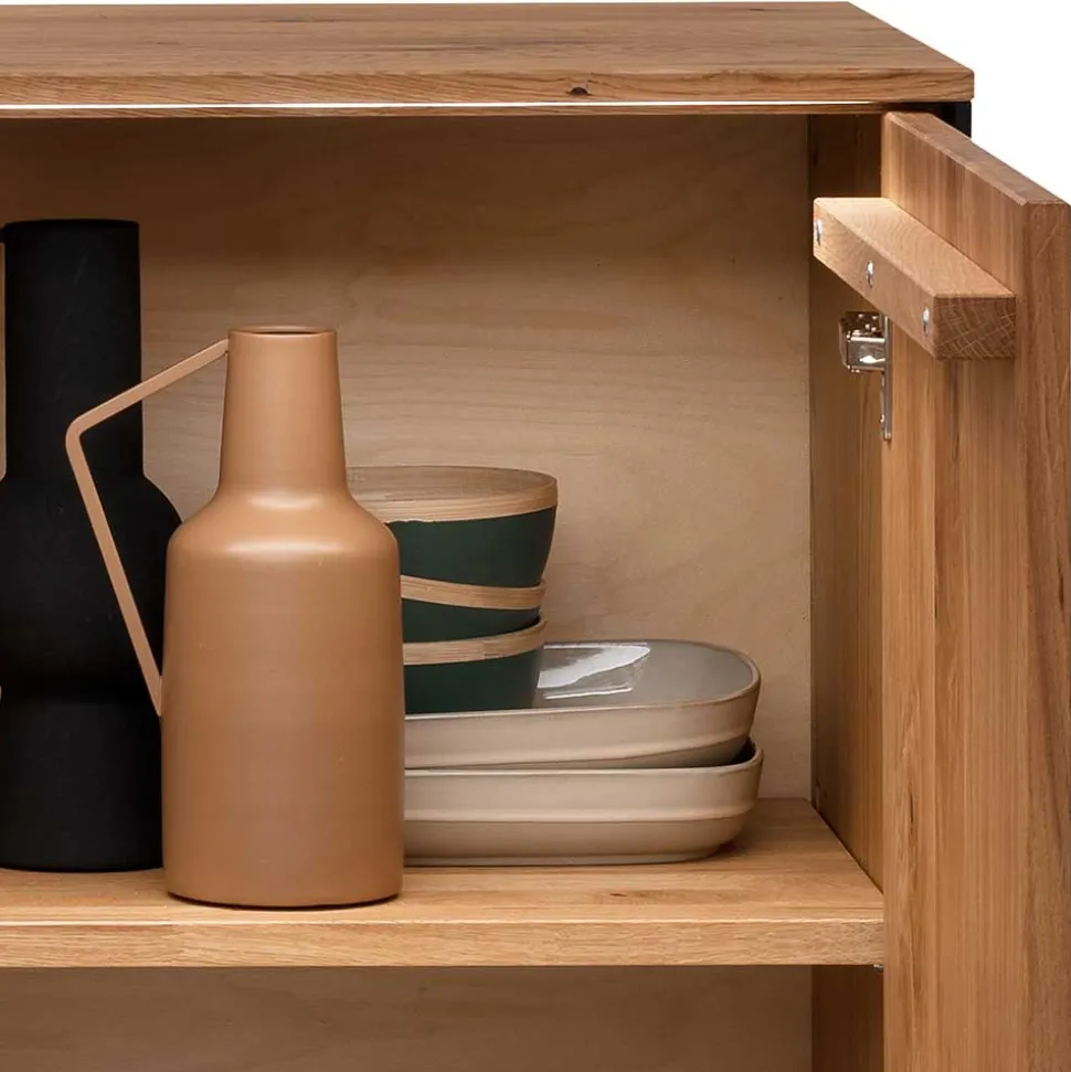 Die Oberflächen des Holzes wurden grob sandgestrahlt. Dieser Prozess hebt die natürliche Textur des Holzes hervor und verleiht der Kommode einen zeitlosen, leicht rustikalen Look. Um den natürlichen Charme der Wildeiche zu bewahren, wurde das Holz zusätzlich mit einem natürlichen Öl behandelt, das die Maserung betont und für einen langanhaltenden Schutz sorgt.