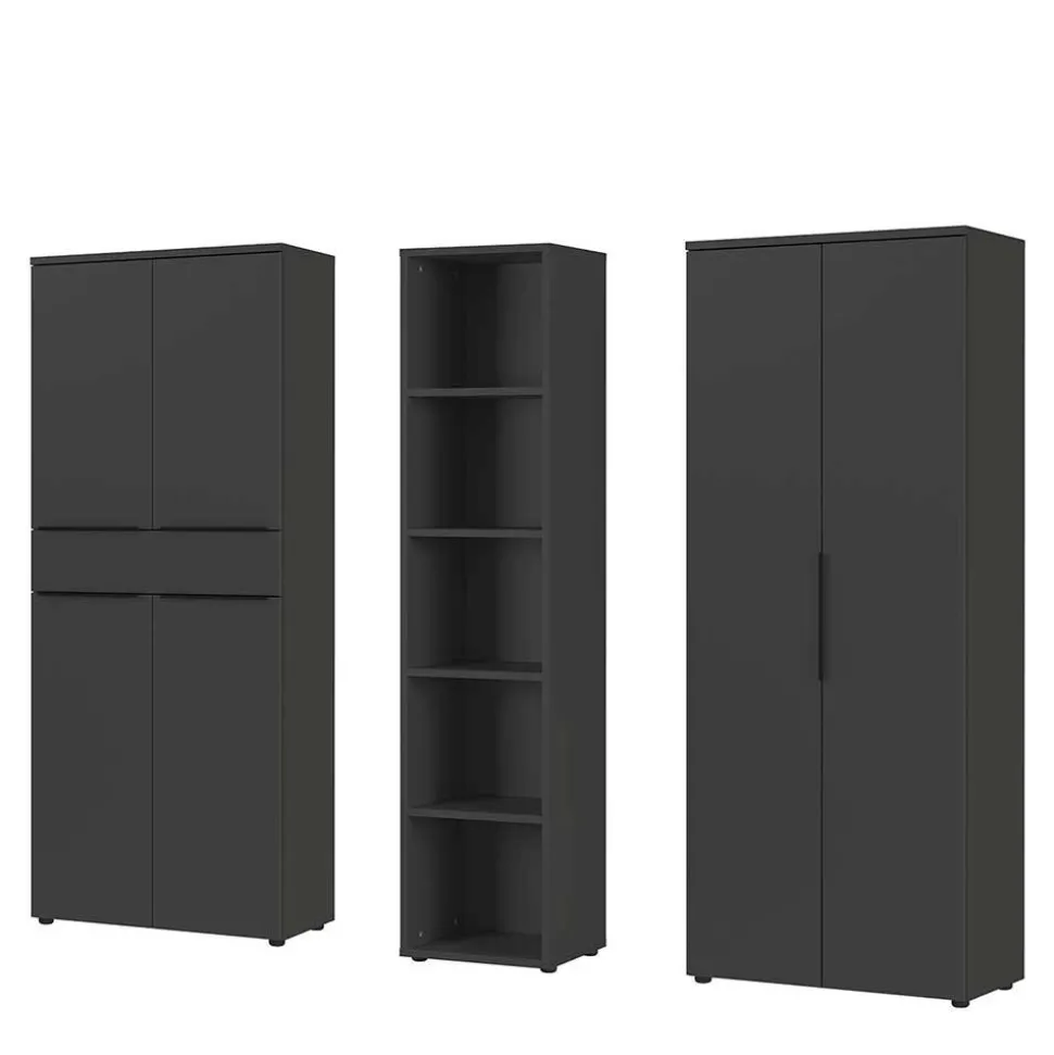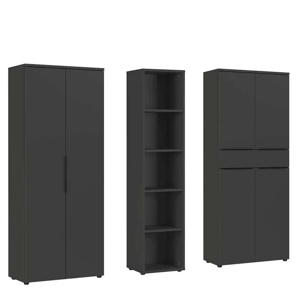 Made in Germany: Hohe Qualität, die überzeugt. Die Büroschränke der Serie Tila bringen Stil und Funktionalität in Ihr Büro oder Homeoffice. In einem eleganten Dunkelgrau gehalten, fügen sich die Möbelstücke harmonisch in jedes moderne Einrichtungskonzept ein. Das geradlinige Design mit klaren Formen und schwarzen Metallgriffen verleiht Ihrem Raum eine zeitlose Eleganz, die Professionalität ausstrahlt.