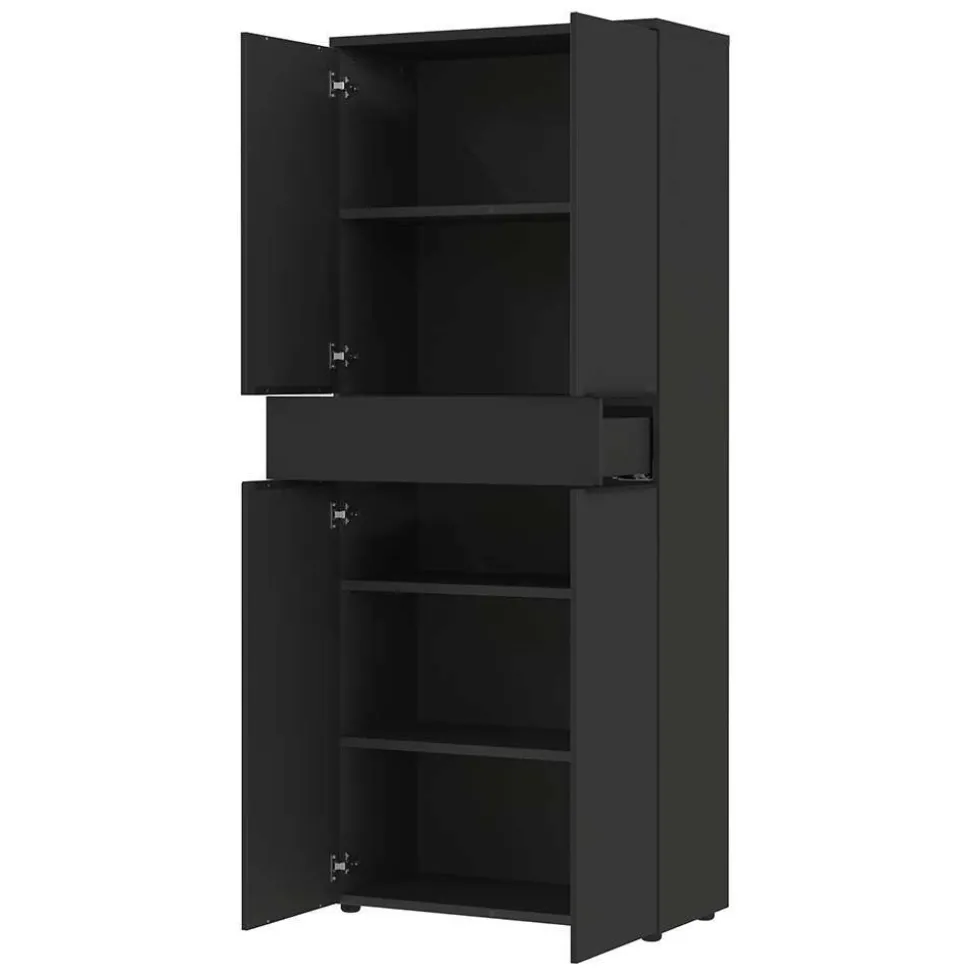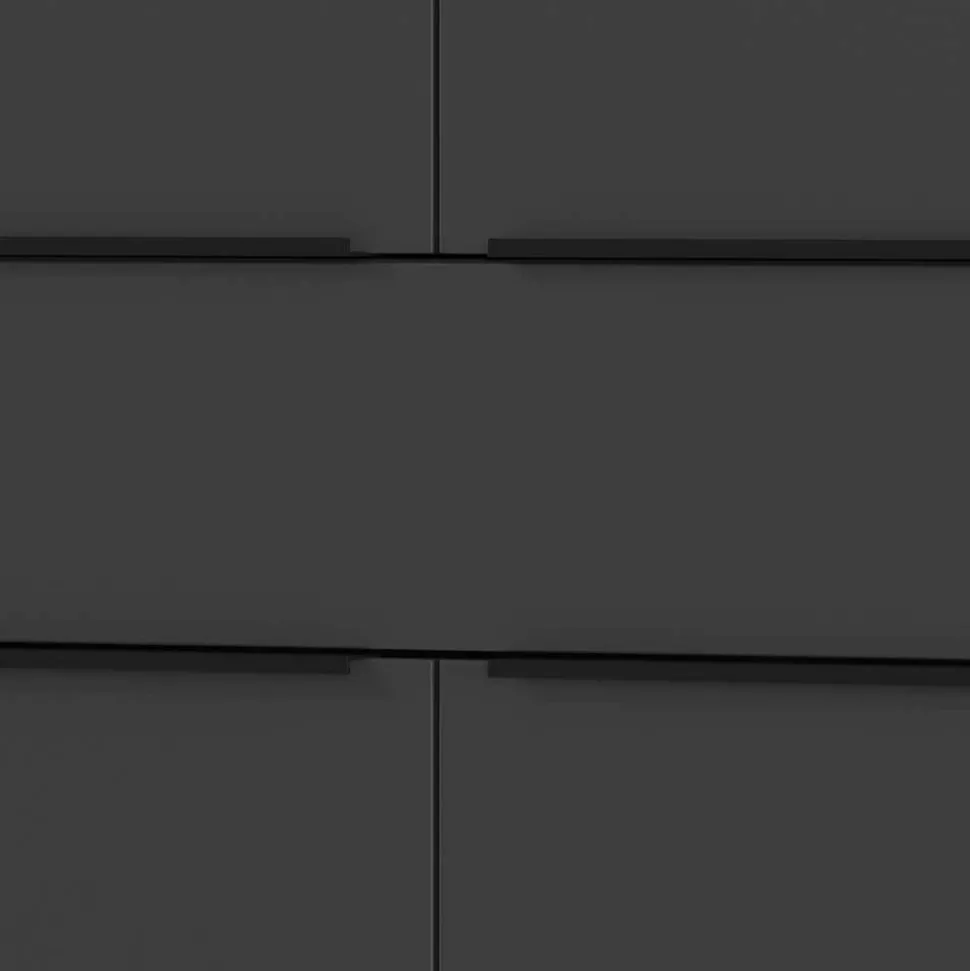 Die Schränke sind mit schwarzen Kunststoff-Bodengleitern ausgestattet, die Ihren Boden schützen. Für eine sichere Nutzung ist eine Kippsicherung an der Wand erforderlich. Das hochwertige Gesamtbild wird durch schwarze Metallgriffe an den Türen und Schubladen abgerundet.