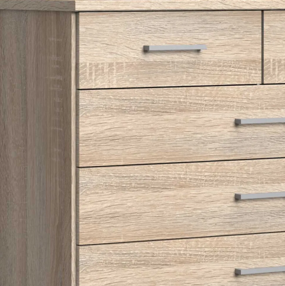 Die Oberfläche der Kommode „Citerna“ ist in einer eleganten Holzoptik Eiche Sägerau foliert, die nicht nur optisch begeistert, sondern auch pflegeleicht ist. Die Folierung schützt das Möbelstück vor Kratzern und Abnutzungserscheinungen, was es ideal für den täglichen Gebrauch macht. Ein feuchtes Tuch genügt, um die Oberfläche in neuem Glanz erstrahlen zu lassen – so bleibt Ihre Kommode immer wie neu.