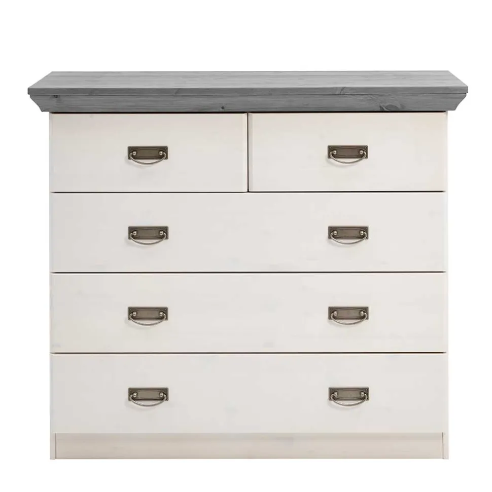 Mit einer Breite von 106 cm, einer Höhe von 91 cm und einer Tiefe von 50 cm bietet die „Mirandesca“ ausreichend Stauraum für Ihre persönlichen Gegenstände. Die elegant gefräste Oberplatte verleiht der Kommode zusätzlichen Charme, während die zwei kleinen und drei großen Schubladen mit Metallauszug für eine bequeme Nutzung sorgen. Die Innenmaße der Schubladen (BxHxT) betragen ca. 42,6/90,1×12,3×38,5 cm und bieten ausreichend Platz für Ihre Habseligkeiten. Die hübschen Bügelgriffe aus Metall an den Schubladen runden das Gesamtbild ab und verleihen der „Mirandesca“ eine stilvolle Note.