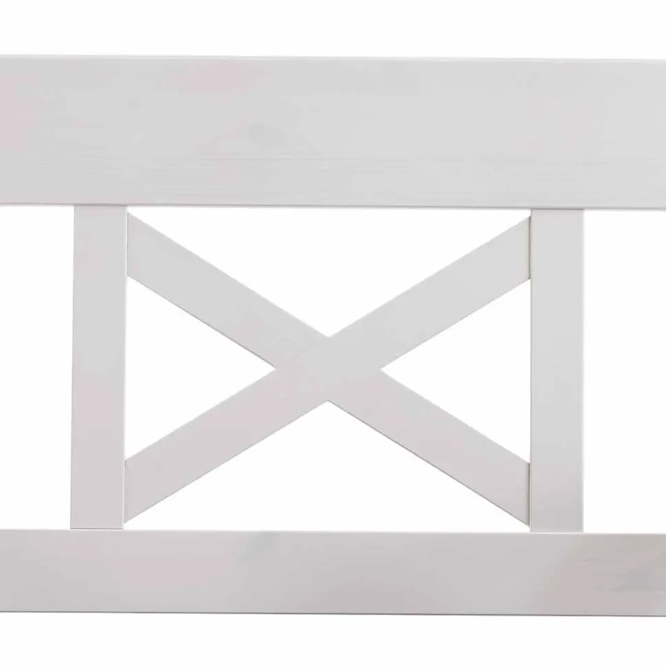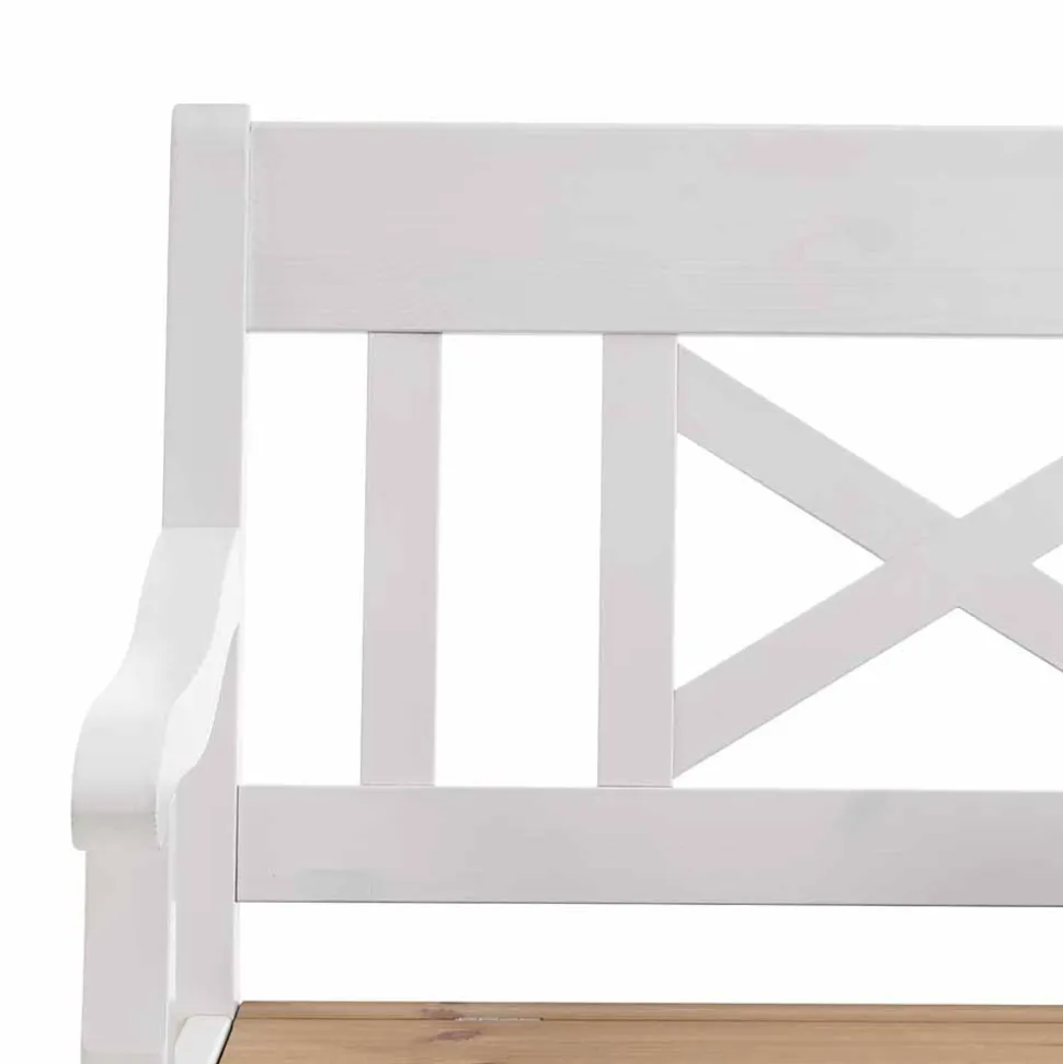 Die dekorative Rückenlehne mit X-Element und Senkrechtstreben verleiht der Bank eine besondere Note und unterstreicht den charmanten Landhaus Look. Schwungvoll gestaltete Armlehnen verleihen der Bank nicht nur Stil, sondern bieten auch zusätzlichen Komfort.