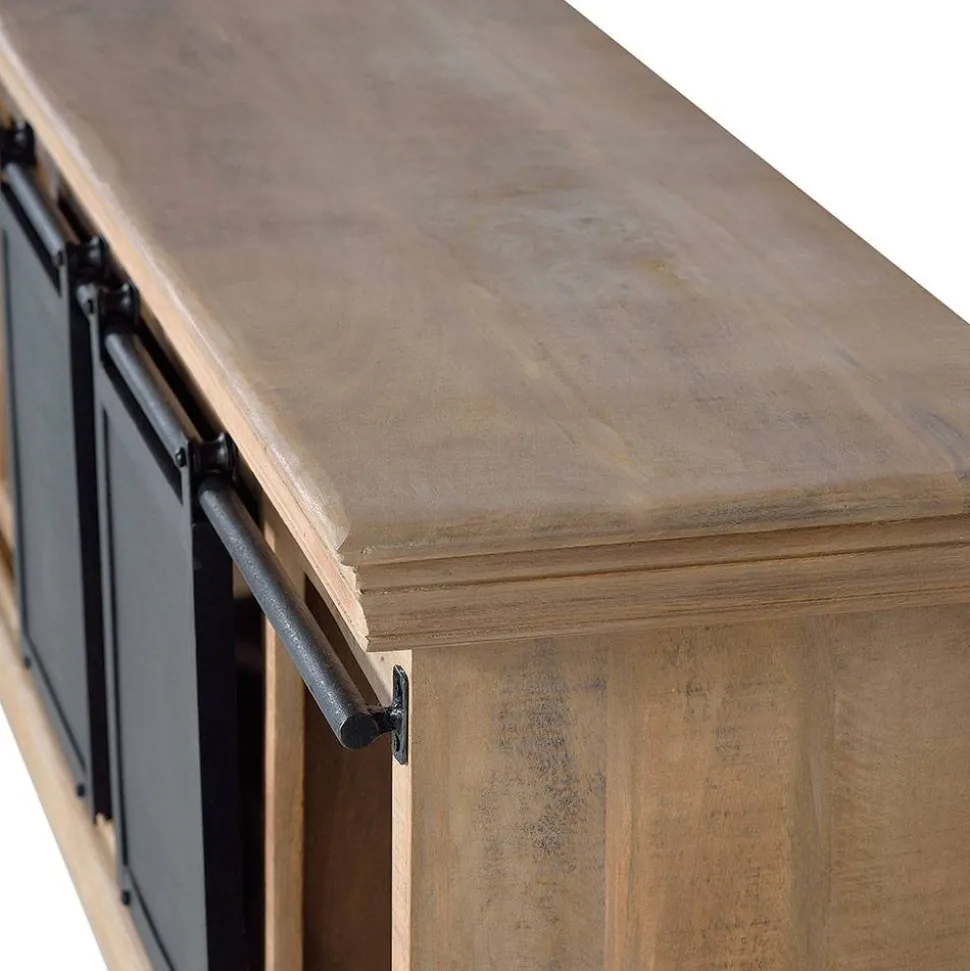Maximaler Stauraum für ein aufgeräumtes Wohnzimmer Praktische Aufbewahrungsmöglichkeiten machen diese Kommode zu einem unverzichtbaren Möbelstück. Zwei seitlich angebrachte Metall-Schiebetüren eröffnen große Staufächer, in denen alles Wichtige ordentlich verstaut werden kann. Drei geräumige Schubladen mit Holzauszügen bieten zusätzlichen Platz für Zubehör, während ein offenes Gerätefach perfekt für Receiver oder Spielkonsolen geeignet ist. Liebevolle Details wie ausgefräste Griffmulden und Metall-Etikettenhalter an den Schubladen unterstreichen den authentischen Charakter des Möbelstücks.