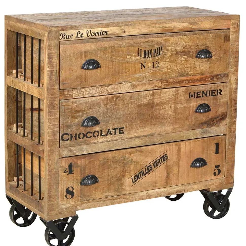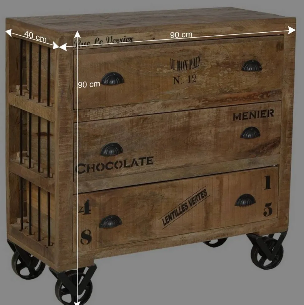 - Offene Seiten mit urigen Metallstangen, die geöffnete Rückwand besteht aus Holzleisten, damit die Schubladen Halt finden