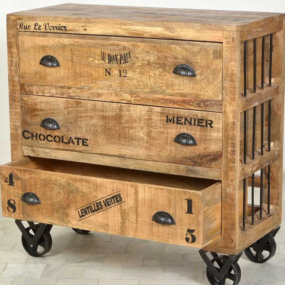 Freuen Sie sich auf ein Stück Handwerkskunst, das Ihre vier Wände in eine stilvolle Erlebniswelt verwandelt. Die Kommode „Indri“ spiegelt mit ihrem Industry und Loft Stil urbanes Flair wider, das an geräumige Fabrikhallen und künstlerische Ateliers erinnert. Dieser Stil ist geprägt von einer Kombination aus Rohmaterialien und minimalistischem Design, was in der „Indri“ Kommode durch die Verwendung von massivem Mangobaumholz und einem rauen, aber schicken Antik Finish zum Ausdruck kommt.