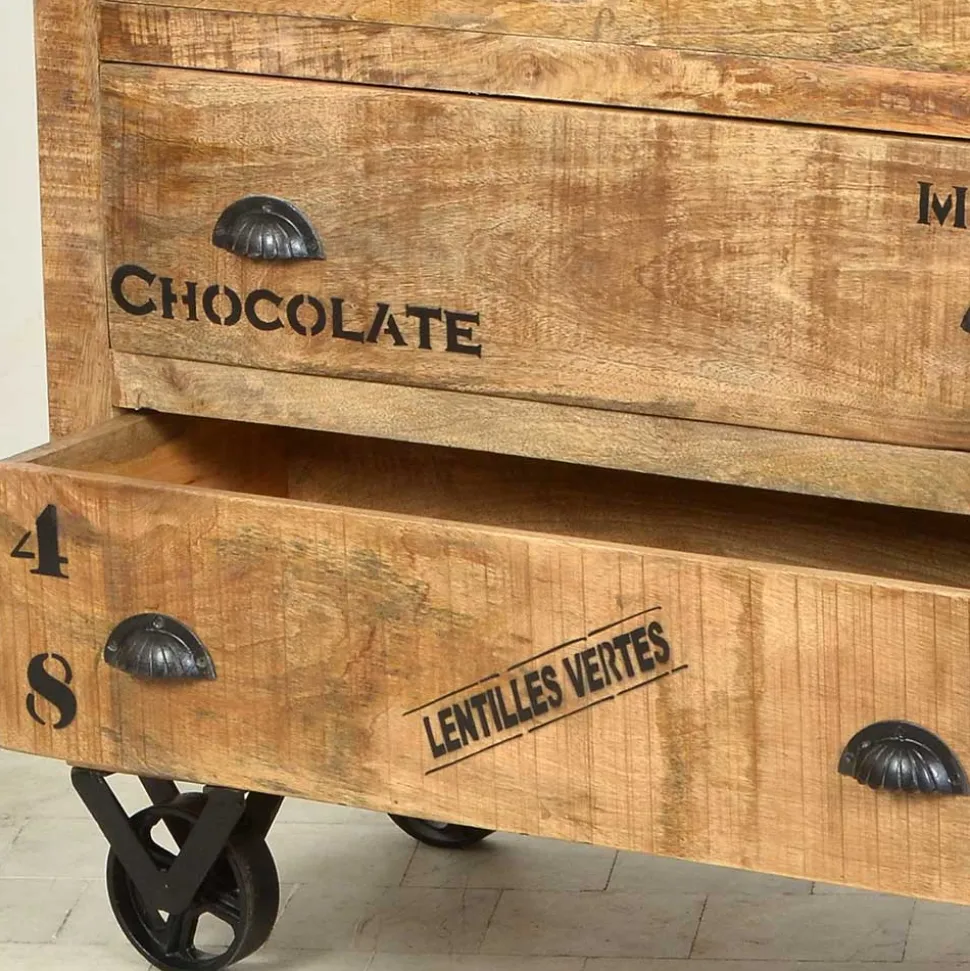 „Indri“ steht auf vier soliden Metallrollen, die Mobilität und Stabilität bieten. Die in Vintage-Schwarz lackierten Rollen und Muschelgriffe setzen einen stilvollen Kontrast zum warmen Mangoholz und unterstreichen das industrielle Design der Kommode.