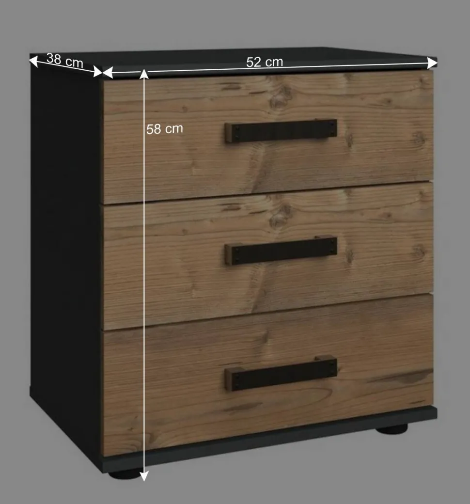 Die pflegeleichten Oberflächen der Möbel sind in einer ansprechenden Holzoptik Tanne und Dunkelgrau foliert. Diese Folierung schützt nicht nur das Material vor Feuchtigkeit und Kratzern, sondern verleiht den Möbeln auch eine elegante und kontrastreiche Farbgestaltung, die in jedem Schlafzimmer ein Highlight setzt.
