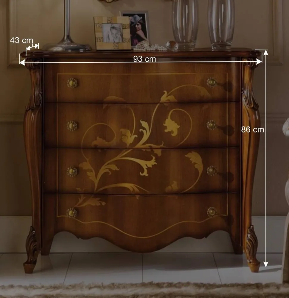 Die italienische Kommode Carlenna II ist 93 cm breit, 83 cm hoch und 43 cm tief. Sie verfügt über vier großzügig bemessene Schubladen auf Holzauszügen mit schwungvoll gestalteten Fronten. Da Ihnen das Möbelstück bereits fertig aufgebaut geliefert wird, können Sie die Kommode zügig am gewünschten Aufstellort in den Einsatz bringen. Beachten Sie bitte, dass es kleinere Teile geben kann, die noch durch Sie anzubringen sind.