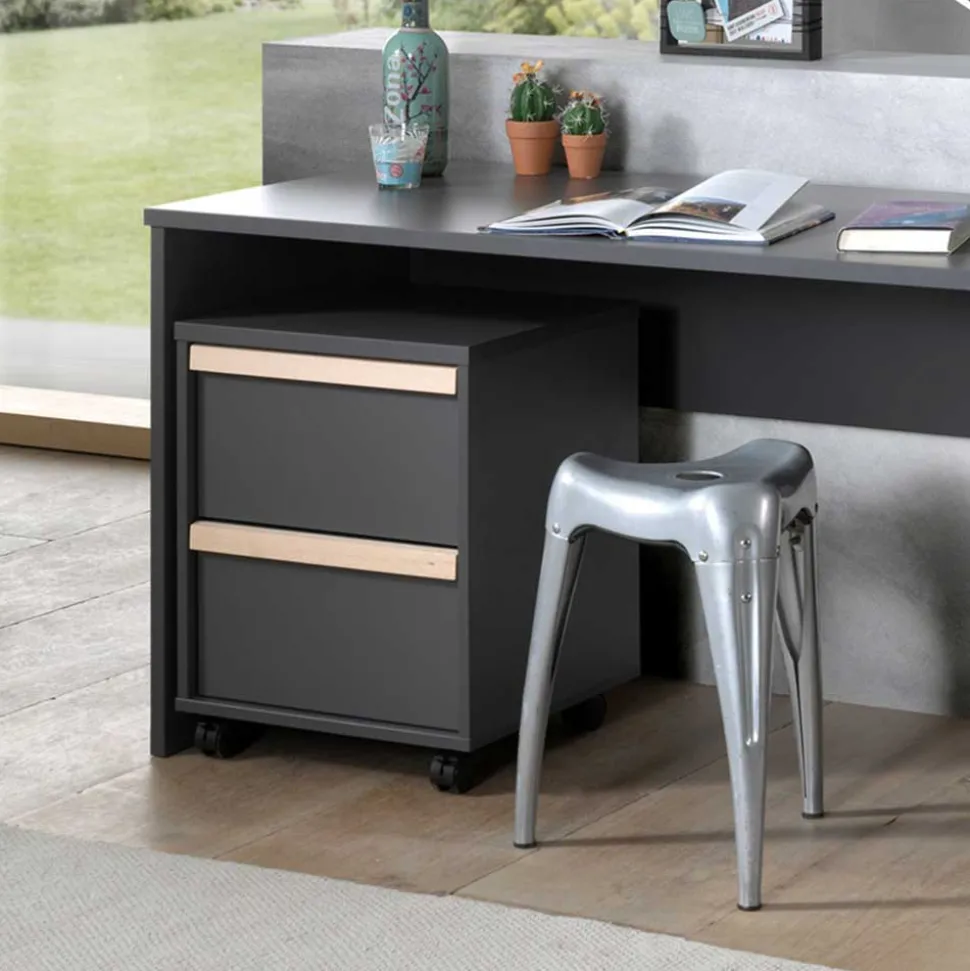 Dieses fünfteilige Einrichtungsset umfasst alles, was ein Jugendzimmer braucht: Ein Einzelbett, eine Nachtkommode, einen Kleiderschrank, einen Schreibtisch und einen Rollcontainer. Die Möbel bestehen aus Holzwerkstoff mit kratzfester und strapazierfähiger Melaminbeschichtung in Anthrazit. Schlichte Griffleisten in langer Ausführung und dekorative Absetzungen am Bett aus Buche Massivholz setzen stilvolle Akzente.