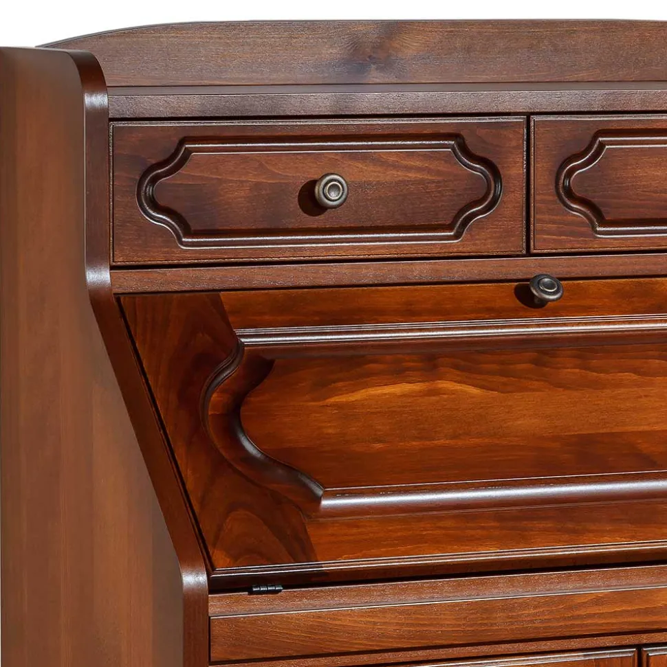 Dieser Sekretär besticht durch seine erstklassige Qualität und Verarbeitung. Hergestellt aus massivem Buchenholz und Spanplatte, überzeugt er mit einer lackierten Massivholz-Oberfläche, die mit Antikfinish patiniert wurde. Auch der Holzwerkstoff ist echtholzfurniert und ebenso behandelt. Das Ergebnis ist ein wahrhaft edles Möbelstück, das in puncto Qualität und Optik höchsten Ansprüchen gerecht wird.
