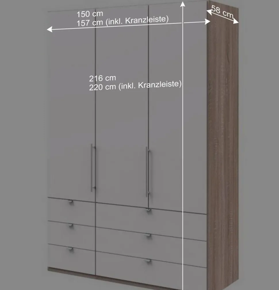 Der Kleiderschrank „Vaclyn“ misst 150 cm in der Breite, 58 cm in der Tiefe und 216 cm in der Höhe. Optional kann ein Passepartout-Rahmen hinzugefügt werden, der die Gesamtbreite auf 157 cm und die Höhe auf 220 cm erhöht. Dieser Schrank verfügt über eine Drehtür rechts und eine Panorama-Falttür in Zwei-Türen-Optik links. Alle Türen verfügen über Metallbeschläge und die Drehtür hat zusätzlich eine Dämpfung, was das Öffnen und Schließen zu einem sanften Erlebnis macht.