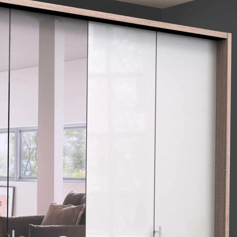 Die weiße Front des Kleiderschranks ist mit einer hochwertigen Glasbeschichtung versehen, die nicht nur ästhetisch ansprechend ist, sondern auch praktische Vorteile bietet. Die Glasbeschichtung verleiht dem Schrank eine moderne Note und lässt ihn zugleich leichter wirken, was besonders in kleinen Räumen von Vorteil ist. Zudem ist die Oberfläche pflegeleicht und lässt sich mühelos reinigen.