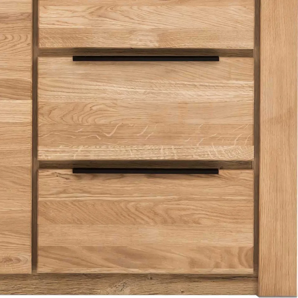 Entdecken Sie die Harmonie von massivem Eichenholz und qualitativer Spanplatte. Die Fronten der Kombi-Kommode „Nelenia“ bestehen aus robustem Eichenholz, bekannt für seine Langlebigkeit und Widerstandsfähigkeit. Der Korpus und die Böden aus Spanplatte gewährleisten Stabilität und Tragfähigkeit, während sie zugleich ein geringeres Gewicht mitbringen. Das Zusammenspiel beider Materialien schafft ein Möbelstück, das sowohl ästhetisch ansprechend als auch funktional ist.