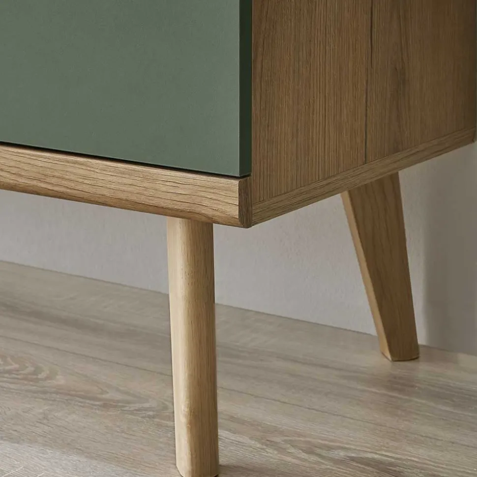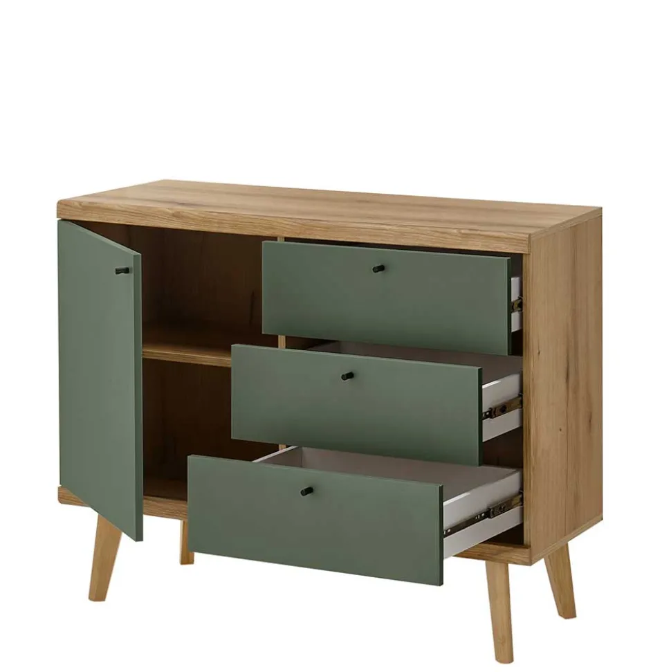 Hochwertige Materialien bilden das Fundament der Kommode „Oliva“. Gefertigt aus robustem Holzwerkstoff für den Korpus und die Fronten sowie massivem Holz für das Vierfußgestell, vereint dieses Möbelstück die besten Eigenschaften beider Materialien. Der Holzwerkstoff, bekannt für seine Stabilität und Langlebigkeit, bietet eine solide Grundlage für das Möbelstück. Zudem ist die Oberfläche mit einer Melaminharzbeschichtung veredelt, die in den Farben Graugrün und Wildeichefarben gehalten ist. Diese Beschichtung sorgt nicht nur für eine ansprechende Optik, sondern bietet auch einen hervorragenden Schutz gegen Kratzer, Feuchtigkeit und alltägliche Abnutzung. So bleibt die Kommode auch nach Jahren intensiver Nutzung noch in einem erstklassigen Zustand.