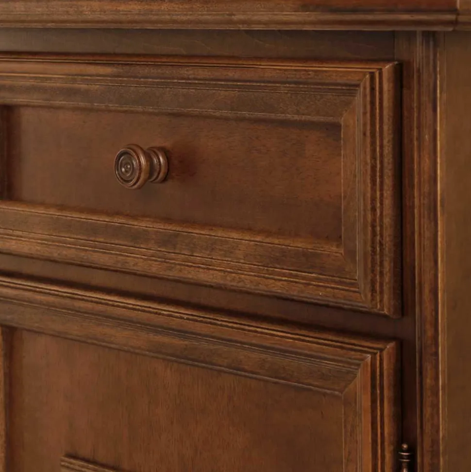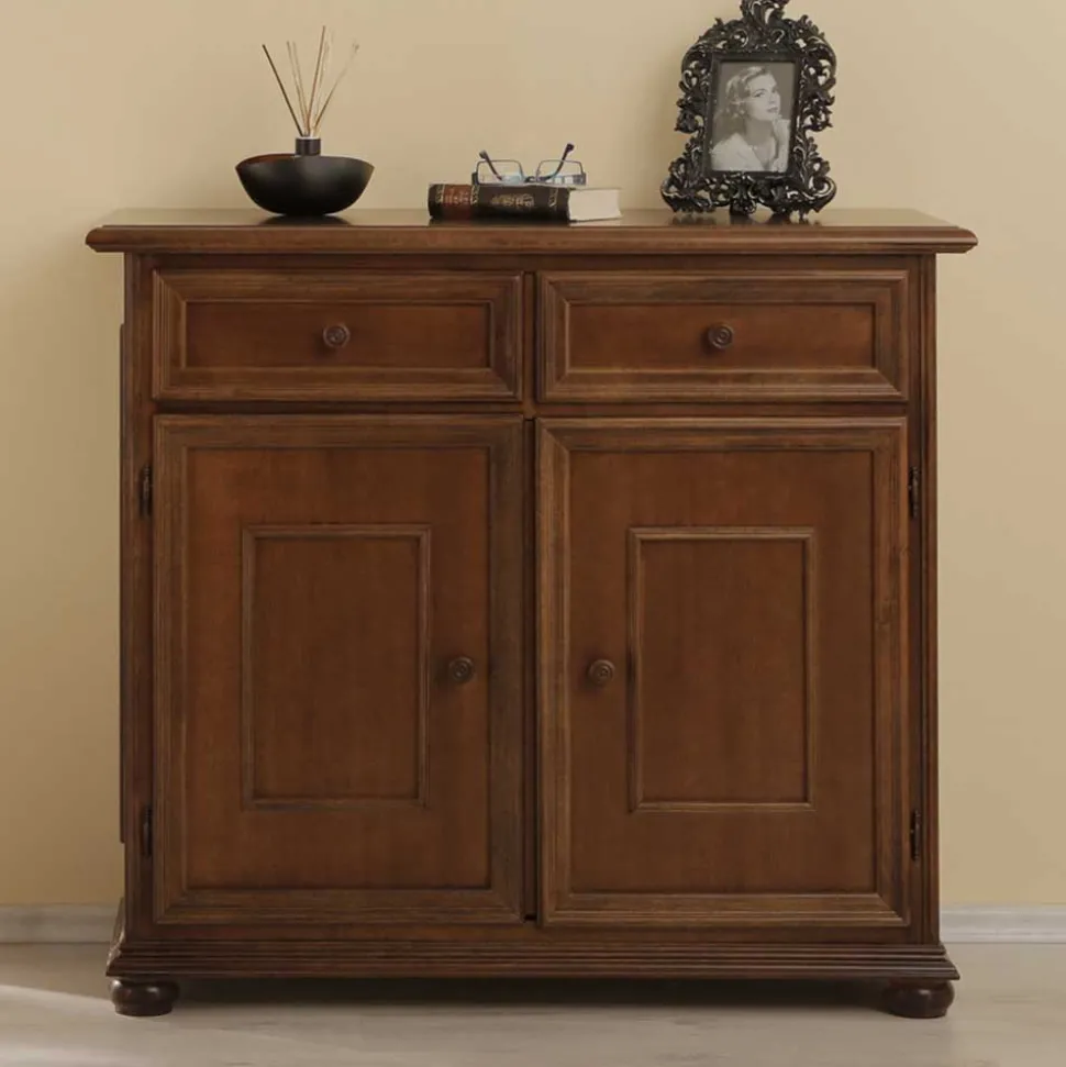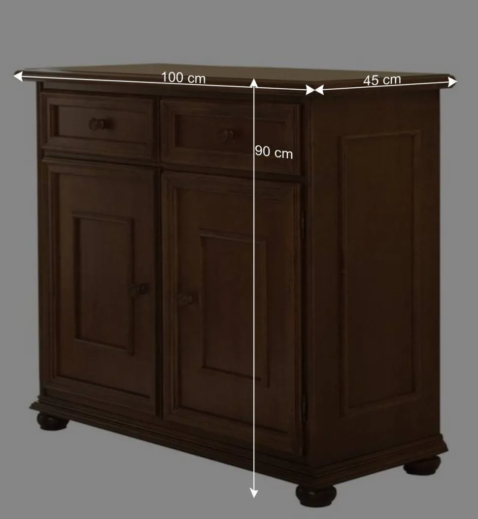 Hergestellt aus einer Kombination von Holzwerkstoffen wie MDF und Spanplatte sowie massivem Holz, beeindruckt die Kommode durch ihre Stabilität und Langlebigkeit. Holzwerkstoff ist bekannt für seine hohe Festigkeit und Formstabilität, während Massivholz mit seiner natürlichen Schönheit und Robustheit besticht. Die walnussbaumfarbig antik gebeizten und lackierten Oberflächen, die von Hand poliert wurden, verleihen der Kommode einen einzigartigen, unnachahmlichen Charme. Handwerkliche Fertigung sorgt für gewollte Farbunterschiede, feine Haarrisse und kleine Unebenheiten, die jedes Stück zu einem Unikat machen.