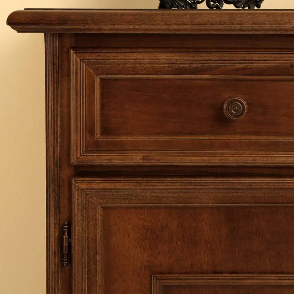 Zwei Türen mit hochwertigen Metallbeschlägen und ein fester Holzboden im Inneren bieten eine stabile Ablagefläche für Ihre Gegenstände. Zwei Schubladen mit Holzauszug und runden Holz Knopfgriffen bieten zusätzlichen Stauraum für kleinere Gegenstände. Die Aufleistungen aus Abachi Massivholz und das Furnier aus Tanganjika Holz unterstreichen die hochwertige Verarbeitung und den edlen Charakter dieses Möbelstücks.