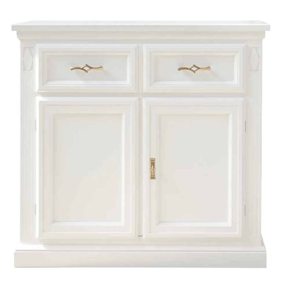 Das stabile Sockelgestell gewährleistet festen Stand und unterstreicht die klassische Gestaltung der Kommode. Dekorativ gestaltete Metallgriffe in Goldfarben setzen edle Akzente und runden das Gesamtbild stilvoll ab. Durch die handwerkliche Fertigung entstehen natürliche Farbunterschiede, Haarrisse oder kleine Unebenheiten, wodurch jedes Exemplar zu einem einzigartigen Einzelstück wird.