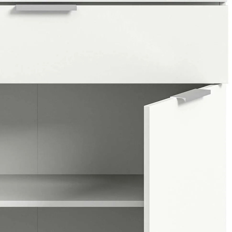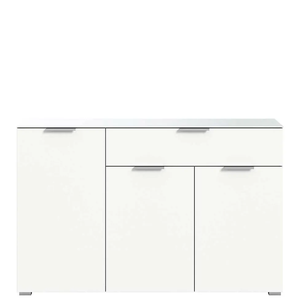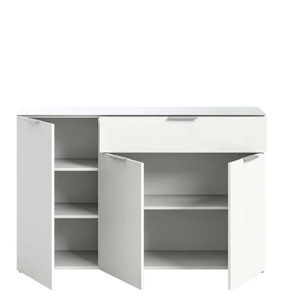 Gefertigt aus robuster Spanplatte und veredelt mit einer 3 mm starken, unterseitig weiß siebbedruckten Glasauflage, überzeugt die Kommode mit einer hochwertigen Optik und praktischen, pflegeleichten Oberflächen. Die dezenten Aluminium-Kantengriffe und silberfarbenen Kunststoffgleiter (2 cm hoch) ergänzen das klare Design funktional und ästhetisch zugleich.