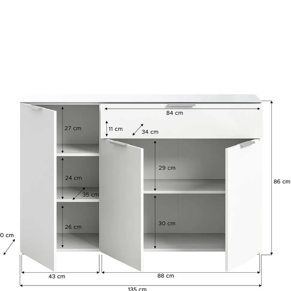 Mit einer Breite von 135 cm, einer Höhe von 86 cm und einer Tiefe von 40 cm bietet die Kombi-Kommode viel Platz bei gleichzeitig platzsparendem Format. Die geringe Bodenfreiheit von 2 cm sorgt für eine bodennahe, stabile Optik. Eine im Lieferumfang enthaltene Kippsicherung zur Wandbefestigung sorgt für zusätzliche Sicherheit im Alltag – besonders in Haushalten mit Kindern oder auf unebenen Böden.