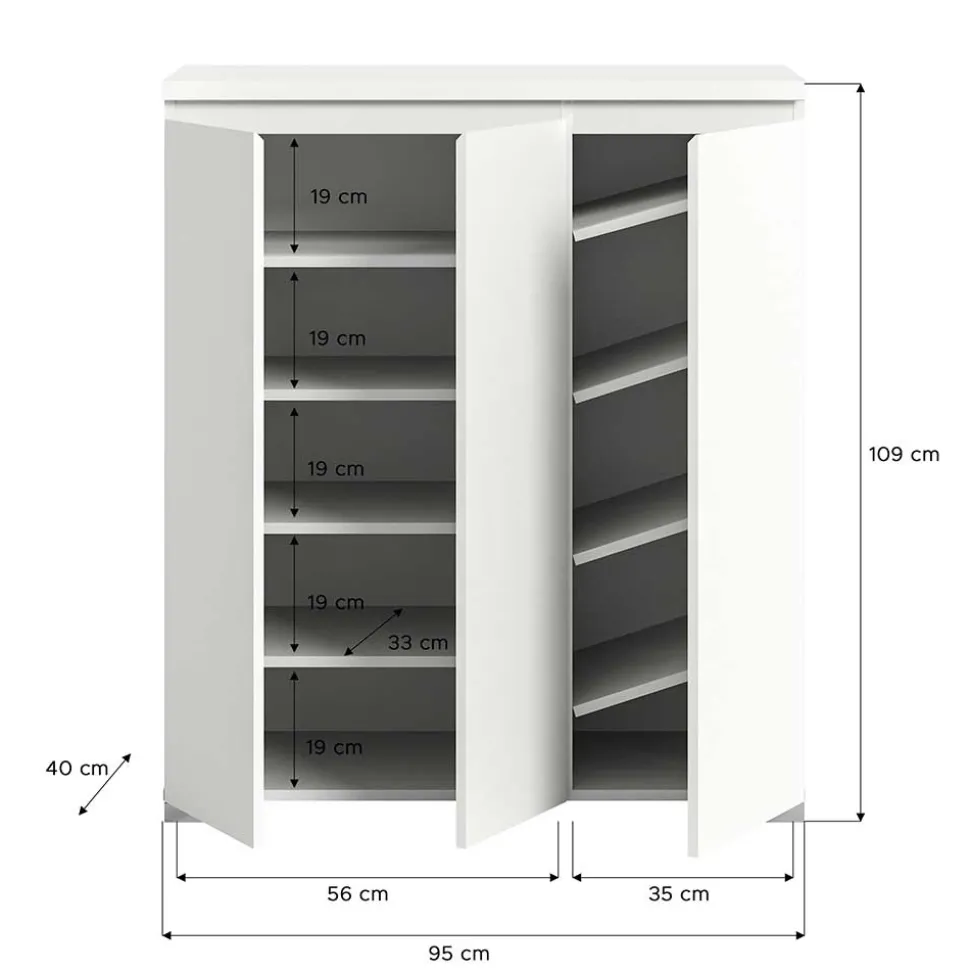Hinter drei elegant verarbeiteten Türen mit stabilen Metallbeschlägen verbirgt sich ein wahres Stauwunder. Die Doppeltür öffnet sich zu vier Einlegeböden, ideal für die Aufbewahrung Ihrer Schuhe. Neben der Einzeltür finden Sie vier schräge Böden, die einen schnellen Zugriff und eine optimale Übersicht gewährleisten. Die grifflosen Öffnungen unterstreichen das minimalistische Design und bieten einen komfortablen, nahtlosen Mechanismus zum Öffnen der Türen.