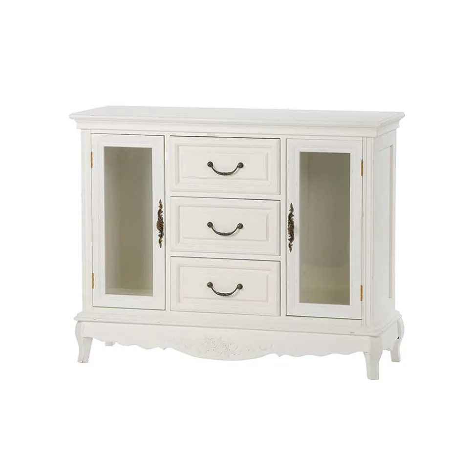 Die Fronten und das verschnörkelte Vierfußgestell bestehen aus massivem Paulownia-Holz – auch als Blauglockenbaum bekannt, ein besonders leichtes, aber dennoch stabiles Edelholz. Die Oberplatte und der Rahmen werden aus robustem MDF gefertigt und sorgen für zusätzliche Formstabilität. Zwei großzügige Glastüren mit stilvollen Glaseinsätzen gewähren Einblick auf die dahinterliegenden Einlegeböden – ideal für dekorative Elemente, Geschirr oder liebevoll arrangierte Accessoires. Ergänzt wird die charmante Gestaltung durch drei praktische Schubladen auf klassischen Holzauszügen, mit Innenmaßen von ca. 40 x 19 x 25 cm – ideal für kleinere Alltagsgegenstände, die schnell zur Hand sein sollen.