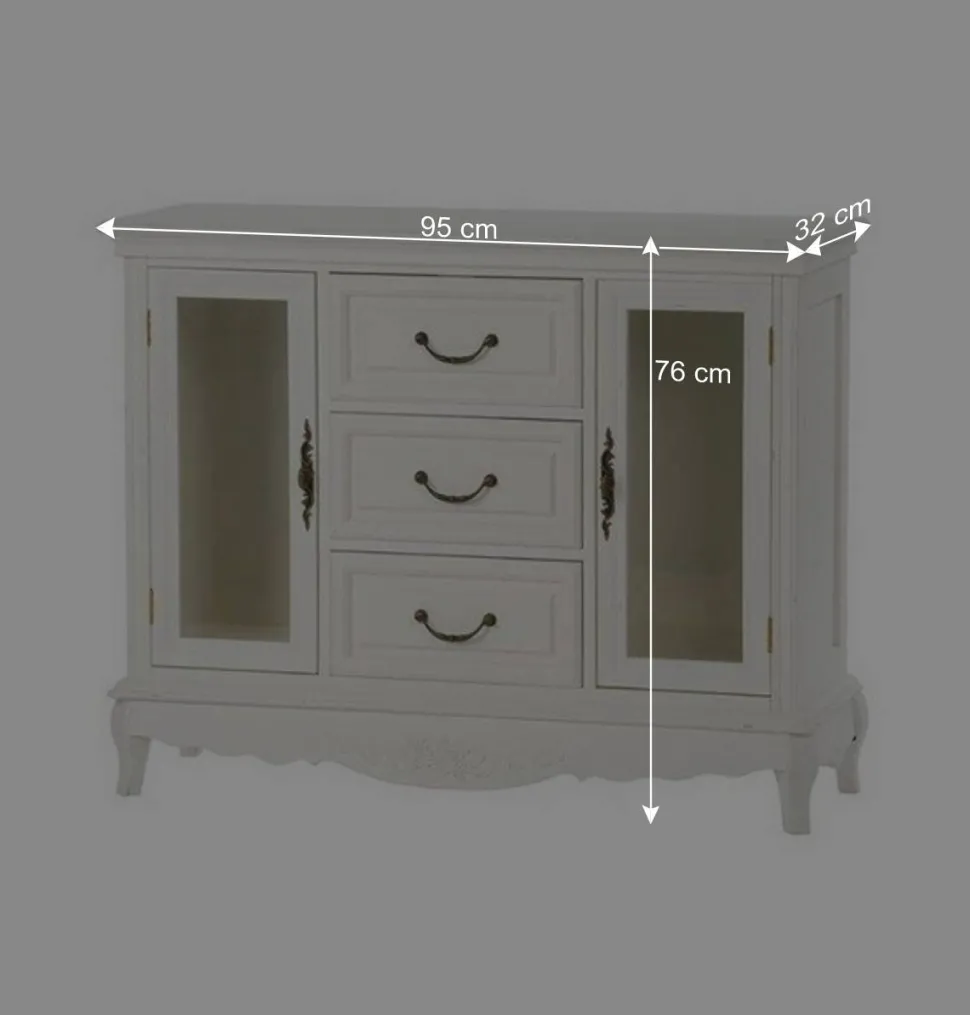 Mit einer Breite von 95 cm, einer Höhe von 76 cm und einer Tiefe von 32 cm fügt sich die Kommode harmonisch in verschiedenste Räume ein – ob im Flur, Wohnbereich oder Schlafzimmer. Ihre rechteckige Form unterstreicht den klassischen Charakter, während die messingfarbenen, zierreich gestalteten Metallgriffe ein stilvolles Highlight setzen und das Gesamtbild gekonnt abrunden.
