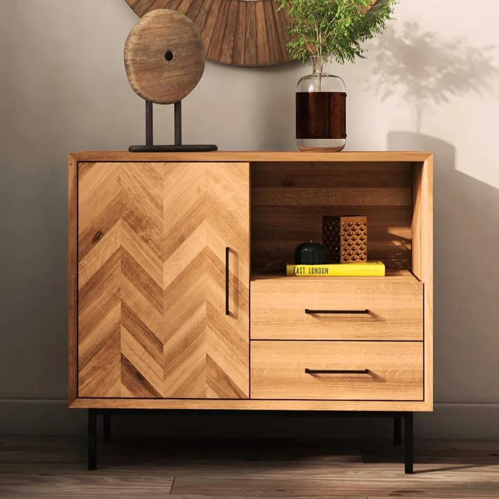 Ein besonderer Hingucker ist die Türfront. Sie besticht durch ein aufwändiges Fischgrätmuster, das dem Möbelstück einen zusätzlichen Charme verleiht und ein Zeugnis für die Liebe zum Detail ist.