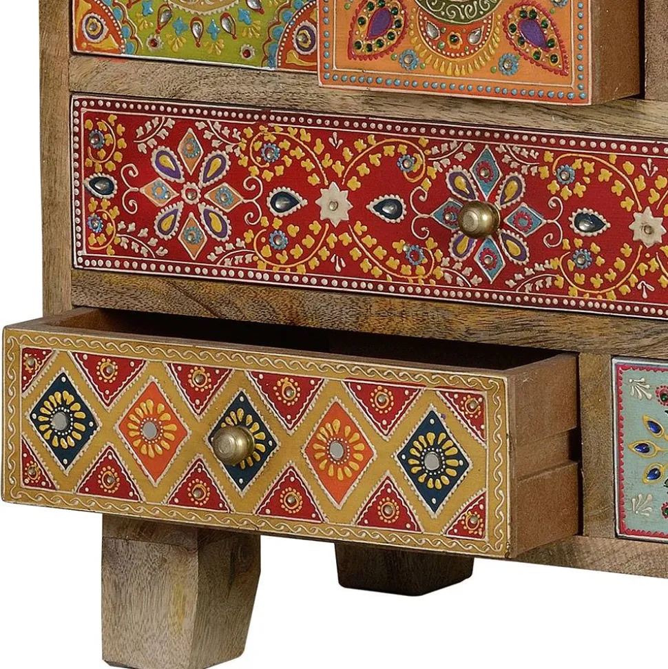 Die Schubladenfronten sind wahre Kunstwerke: Unterschiedliche Muster, Ornamente und farbliche Nuancen verleihen jeder Schublade ihren eigenen Charakter. Die runden Metallknöpfe in Altmessing-Optik unterstreichen den charmanten Vintage-Look. Dank der unterschiedlichen Größen der Schubladen bietet die Kommode vielseitige Stauraummöglichkeiten – ideal, um kleine Alltagsgegenstände stilvoll zu verstauen.