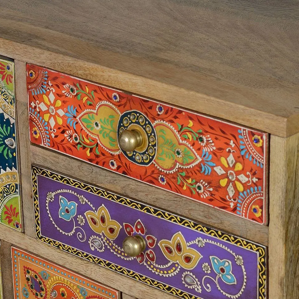 Mit der Kommode „Edro“ zieht ein echtes Unikat in Ihr Zuhause ein! Gefertigt aus massivem Mangoholz, beeindruckt dieses Möbelstück mit seiner charaktervollen Optik und verspielten Details. Die neun unterschiedlich gestalteten Schubladen setzen farbenfrohe Akzente und machen „Edro“ zum Blickfang in jedem Wohnbereich. Perfekt für ein gemütliches Boho-Ambiente, bringt diese Kommode Wärme, Individualität und praktische Funktion in Ihr Zuhause.