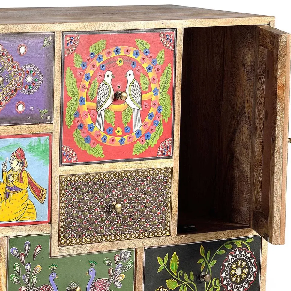 Mit der Kommode „Precio“ holen Sie sich einen außergewöhnlichen Blickfang in Ihre vier Wände. Die Kombination aus warmem Mangoholz in Naturfarbe und einer kunstvoll handbemalten Front mit farbenfrohen, orientalischen Mustern verleiht jedem Raum eine ganz besondere Atmosphäre. Jede Kommode ist ein echtes Unikat und überrascht mit individuellen Farbnuancen und Details, die das Möbelstück unverwechselbar machen. Der Charme dieses besonderen Designs fügt sich hervorragend in vielseitige Wohnkonzepte ein und bringt einen Hauch Exotik in Ihr Zuhause.