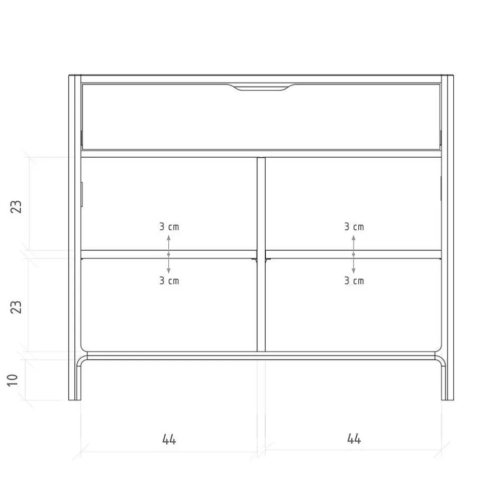 Mit einer Breite von 95 cm, einer Höhe von 80 cm und einer Tiefe von 50 cm bietet die Kommode großzügigen Stauraum, ohne dabei zu viel Platz einzunehmen. Formschön abgerundete Ecken unterstreichen die hochwertige Verarbeitung und sorgen für eine weiche, freundliche Linienführung. Die Materialstärke von 2 cm steht für Stabilität und Langlebigkeit.