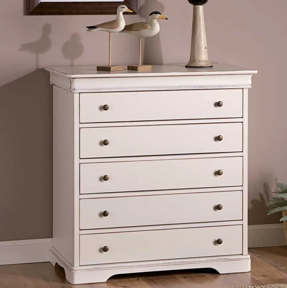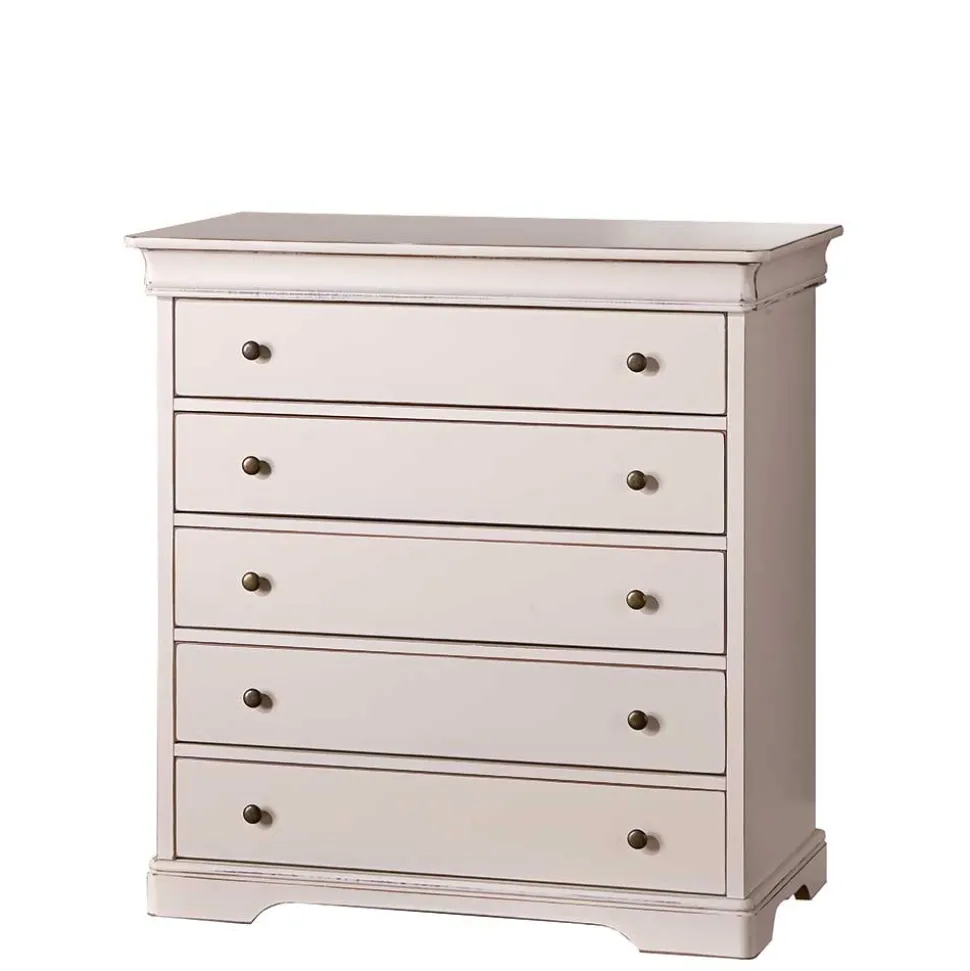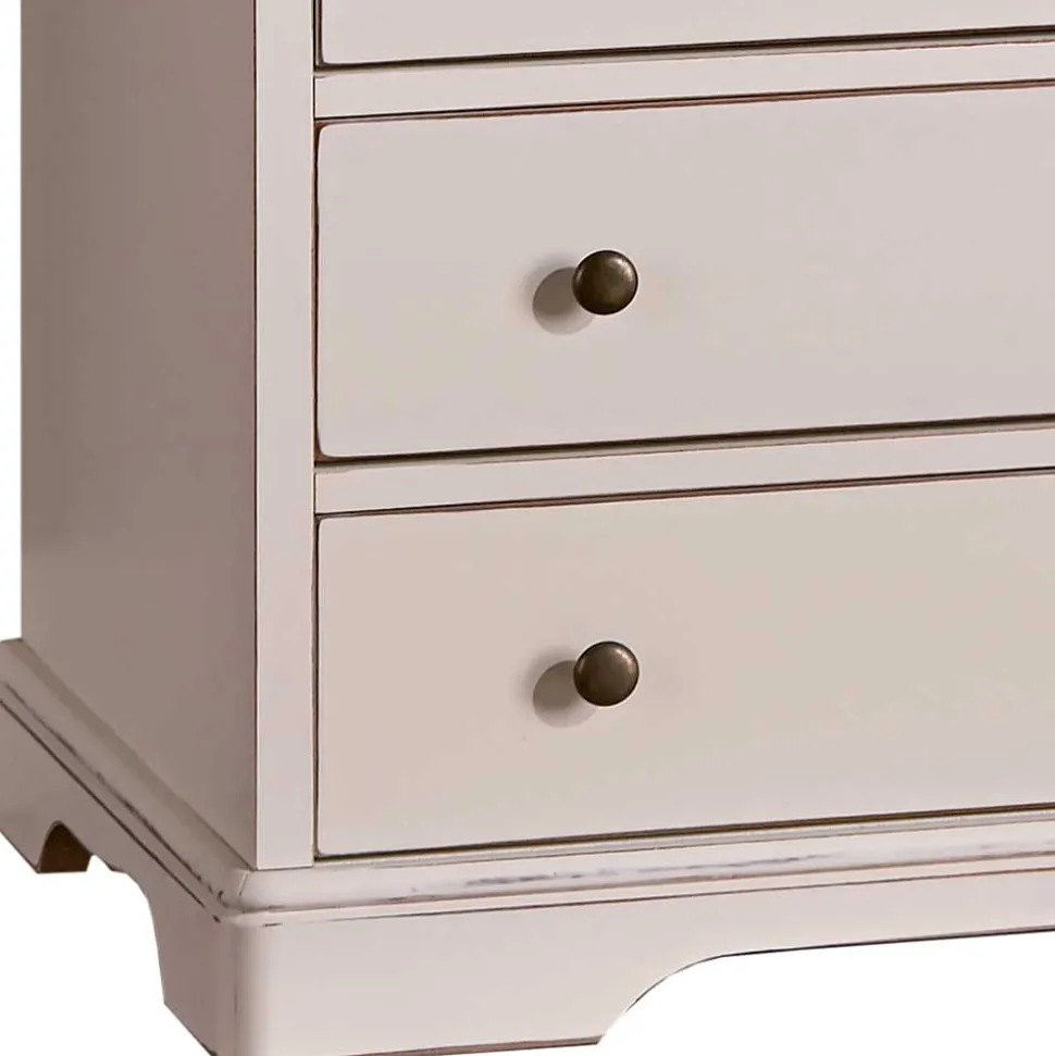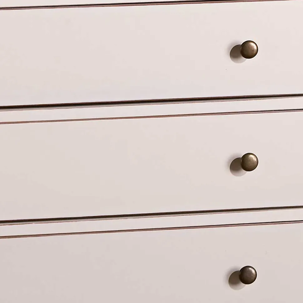 Gefertigt aus Tulpenbaum-Massivholz für Rahmen und Gestell, Pappelholz für die Schubladen sowie MDF für Seiten und Deckplatte, überzeugt die Kommode durch Stabilität und eine wertige Haptik. Die Oberflächen sind lackiert und furniert, was die natürliche Maserung sanft betont. Runde Metall-Knopfgriffe in Altmessingfarben setzen nostalgische Akzente und runden den Vintage Look perfekt ab.