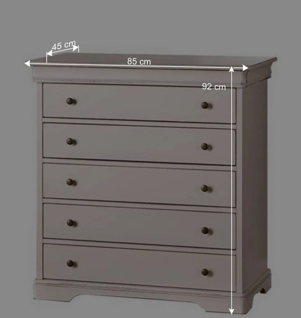 Mit einer Breite von 85 cm, einer Höhe von 92 cm und einer Tiefe von 45 cm bietet die Kommode großzügigen Stauraum bei gleichzeitig platzsparender Wirkung. Die Lieferung erfolgt fertig montiert, lediglich kleinere Anbauteile sind gegebenenfalls noch anzubringen.