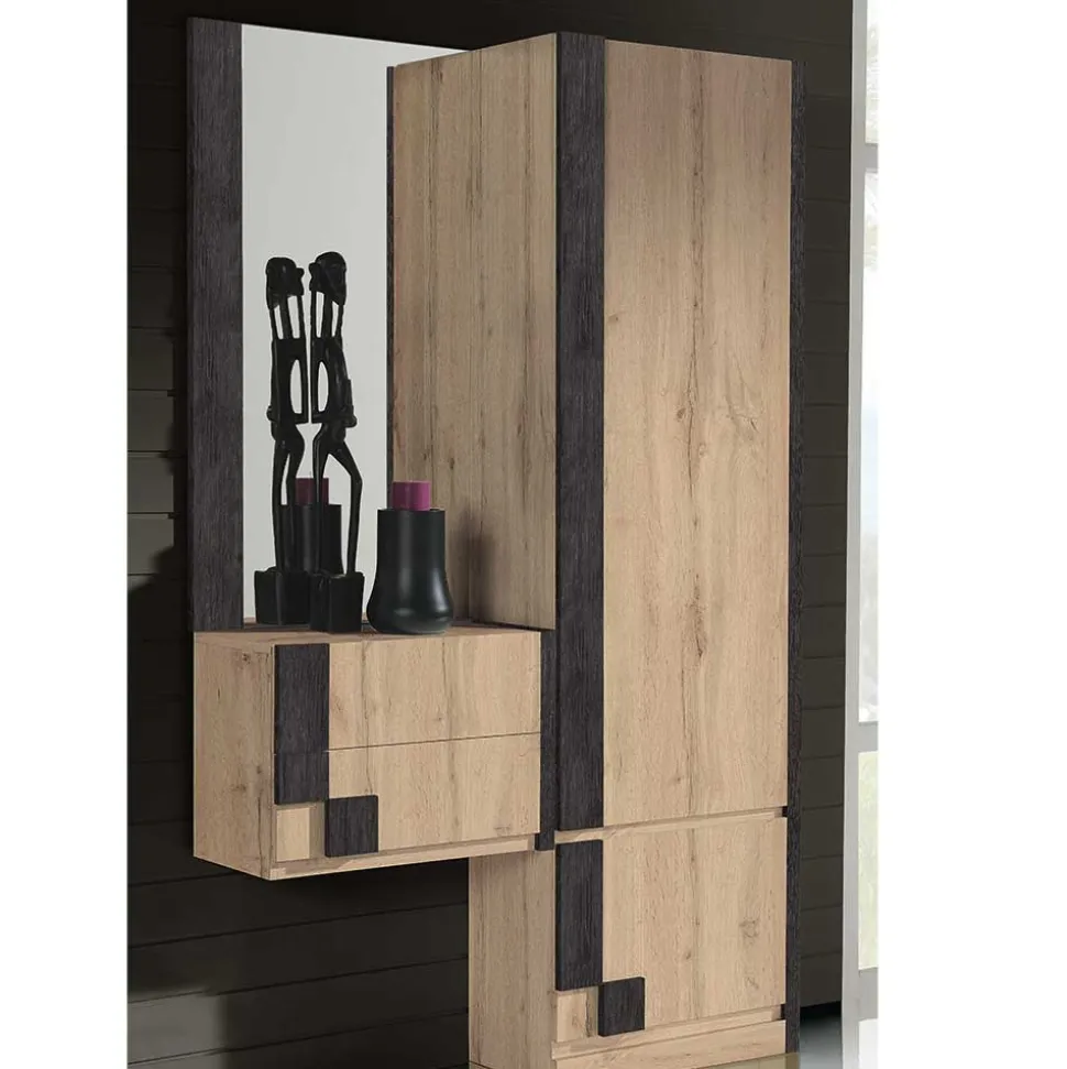 - Melaminbeschichtete Oberfläche in wildeichefarbiger und schwarzgrauer Holzoptik