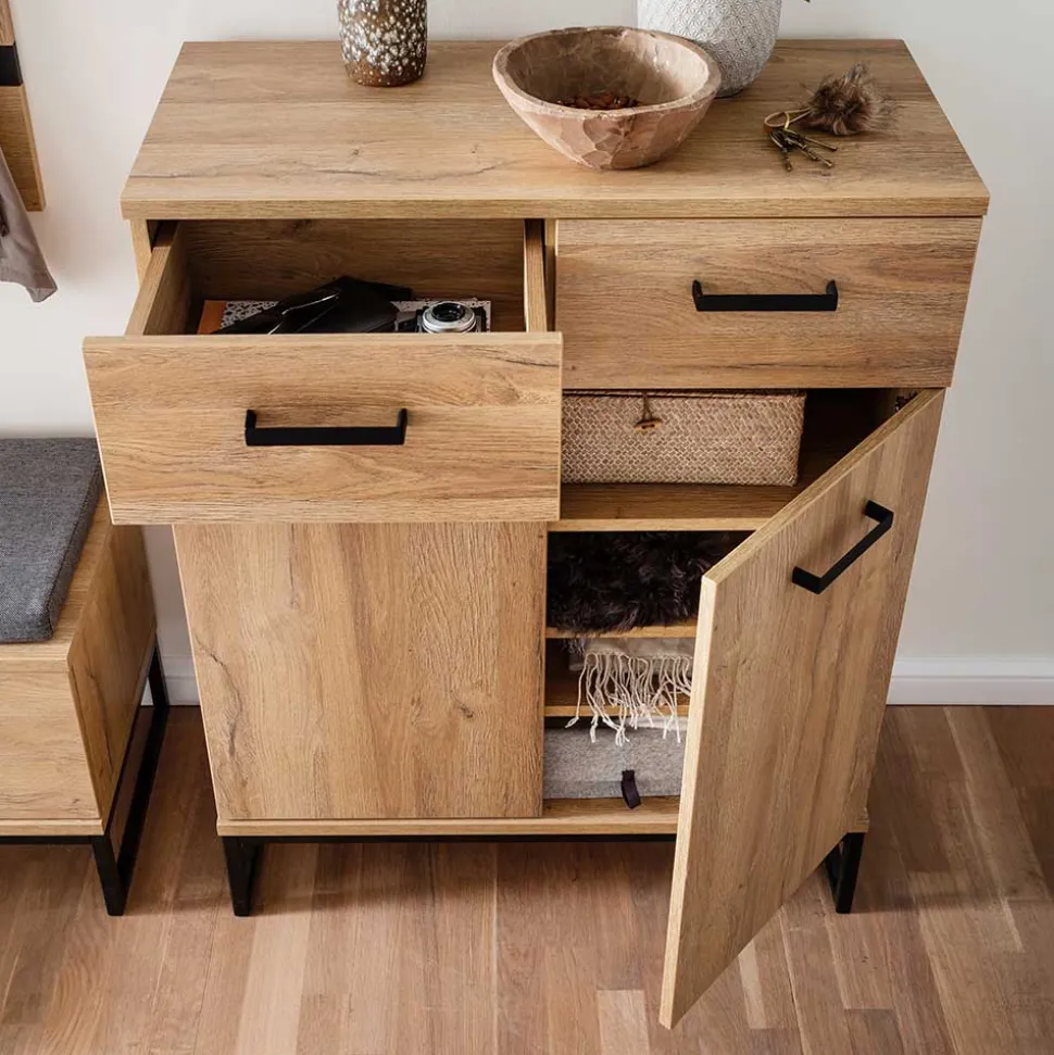 Die Garderoben-Kombination „Truvisas“ überzeugt nicht nur durch ihr ästhetisches Design, sondern auch durch ihre hochwertige Verarbeitung. Hergestellt aus robuster Spanplatte in Holzoptik Wildeiche, ist sie nicht nur visuell ansprechend, sondern auch äußerst langlebig. Die Melaminbeschichtung schützt die Oberflächen vor Kratzern und Abnutzung, wodurch Ihre Garderoben-Kombination lange Zeit wie neu aussehen wird.