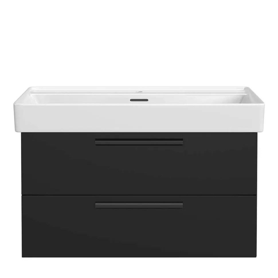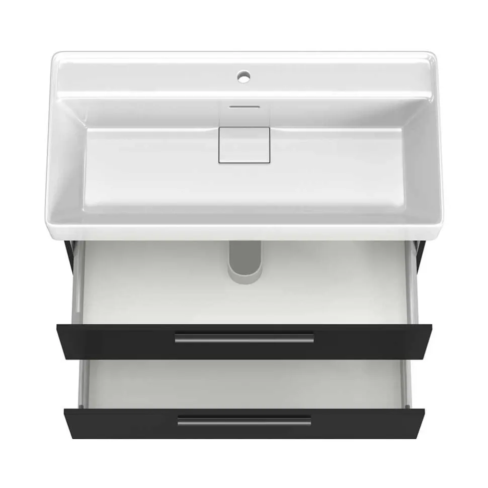 Hinter der stilvollen Fassade steckt eine durchdachte Stauraumlösung: Zwei großzügige Schubladen mit langlebigen Metallauszügen bieten ausreichend Platz für Pflegeprodukte und Badutensilien. Dank der Soft-Close-Technologie schließen sie besonders leise und sanft. Die obere Schublade ist mit einem praktischen Siphonausschnitt versehen, sodass der Stauraum optimal genutzt werden kann. Die schmalen, schwarzen Metallgriffe in Leistenform unterstreichen das minimalistische Design.