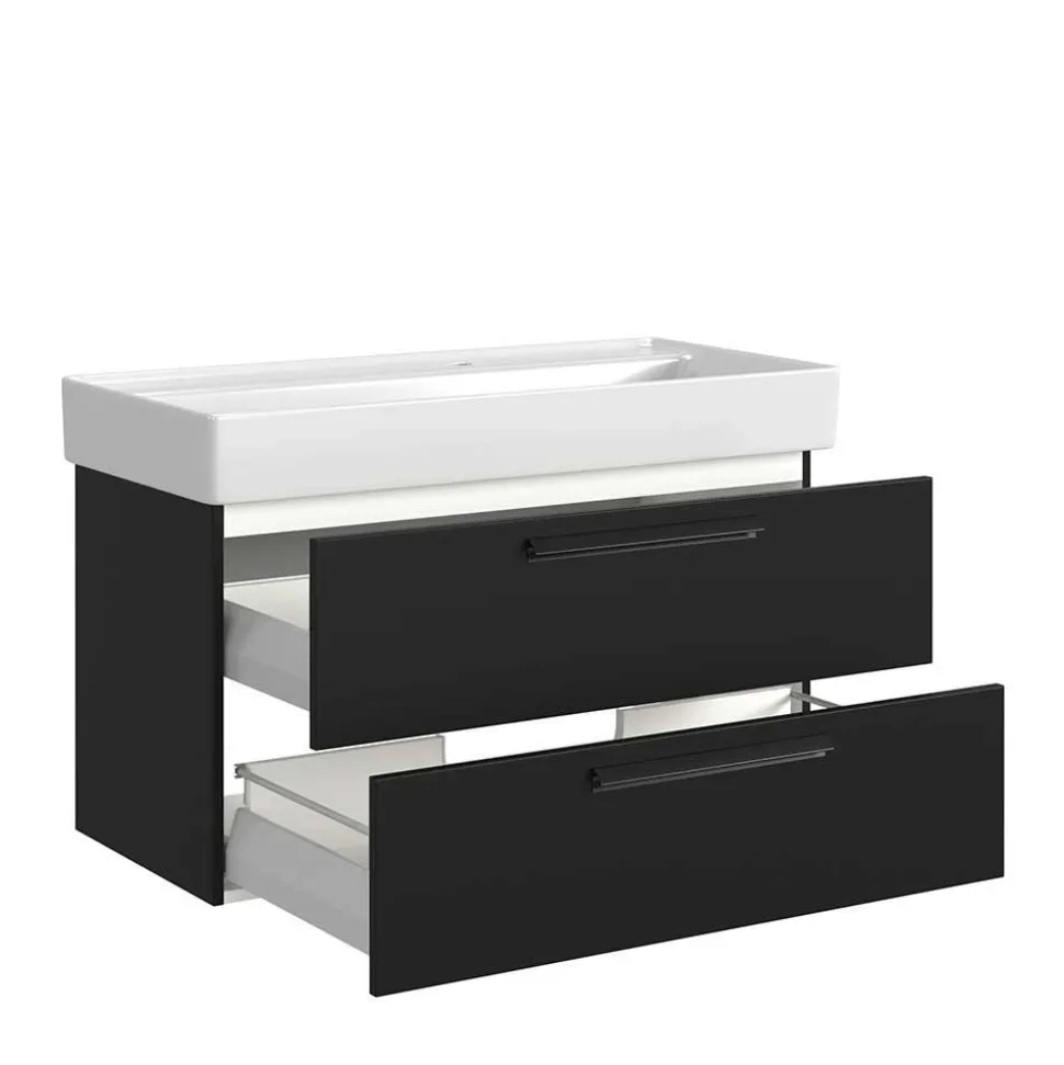 Hergestellt aus robustem MDF, bietet der Waschtisch eine langlebige und pflegeleichte Oberfläche. Außen präsentiert sich „Ostoro“ in einer edlen schwarzen Folierung, die nicht nur optisch überzeugt, sondern auch widerstandsfähig gegenüber Feuchtigkeit ist. Die Innenseiten der Schränke sind in Weiß gehalten, was für eine helle und freundliche Optik im Inneren sorgt. Die tiefgezogenen Kanten verstärken die Stabilität und verleihen dem Möbelstück eine hochwertige Haptik.