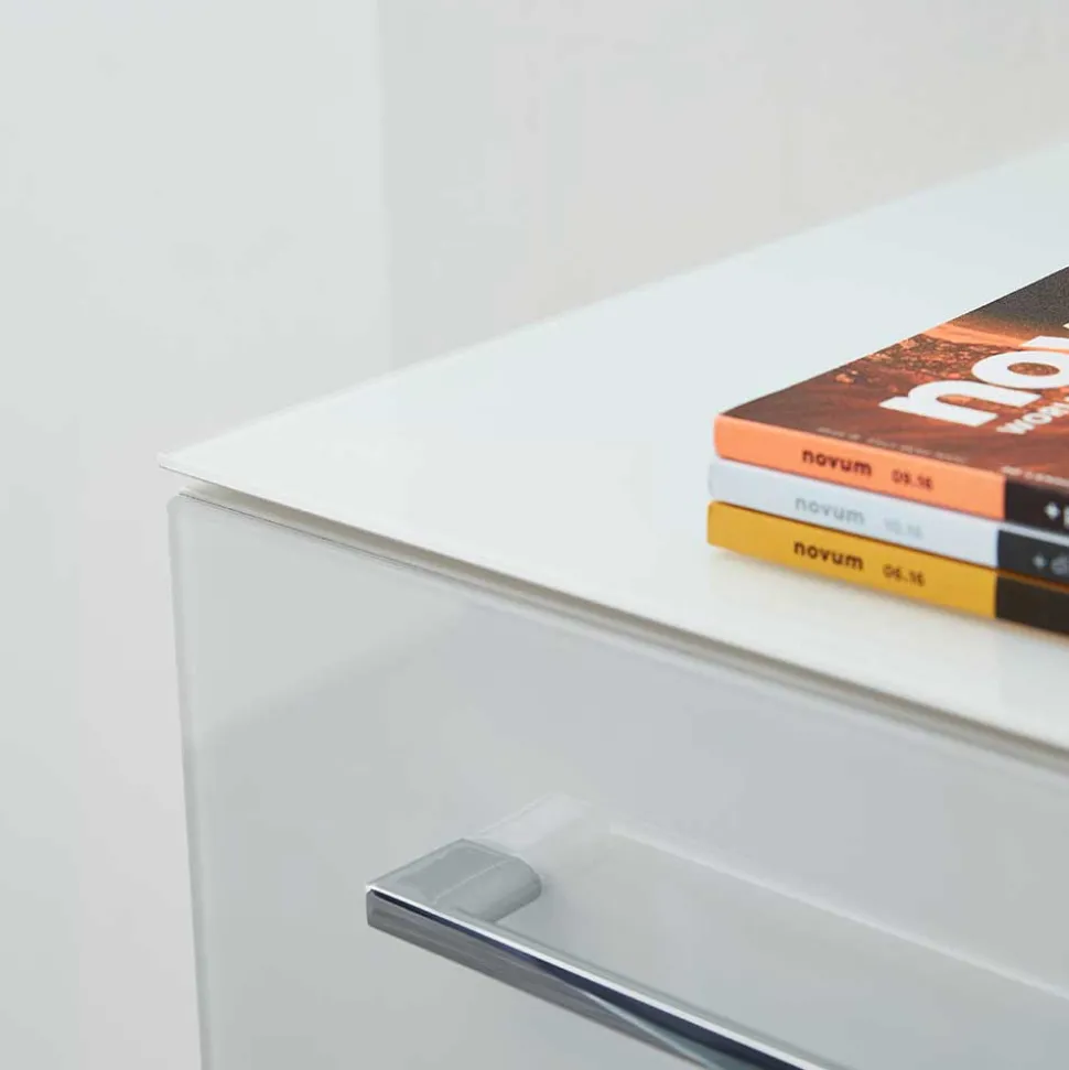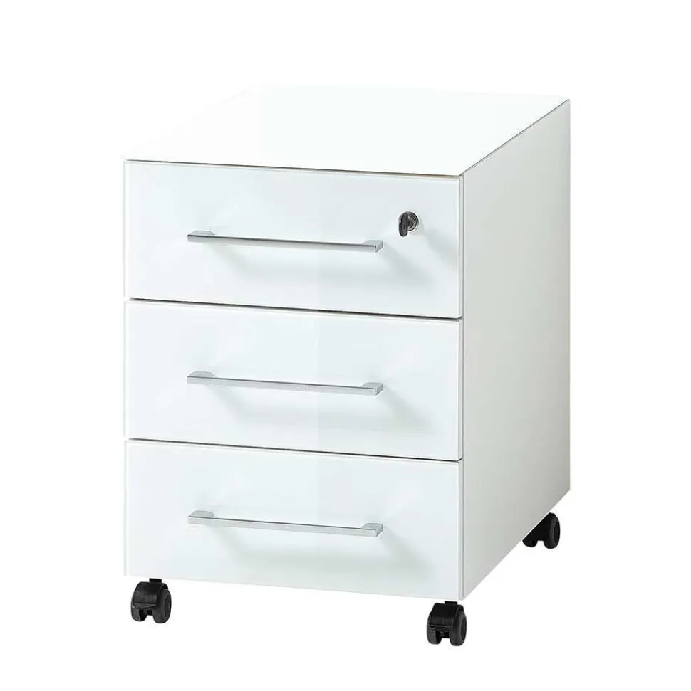 Die abschließbaren Türen mit gedämpften Metallscharnieren, alle Fächer in Ordnerhöhe und die Schubkästen mit gedämpftem Metallauszug und Selbsteinzug unterstreichen die durchdachte Konstruktion und Benutzerfreundlichkeit von „Fidania“. Die dezente Eleganz der länglichen Bügel-Metallgriffe in Chromfarben rundet das Design ab und macht die Möbel zu einem stilvollen Highlight in jedem Büro.