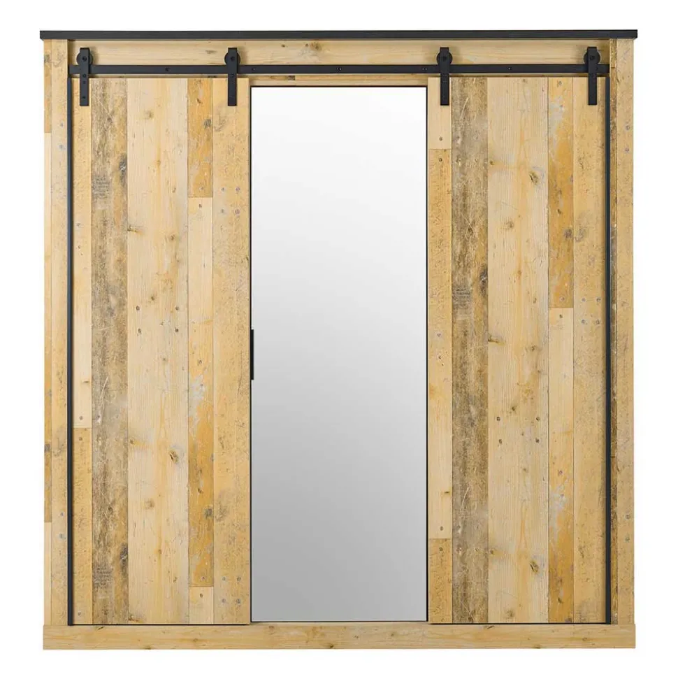 - Zwei Schiebetüren außen und eine Drehtür mit Spiegel mittig