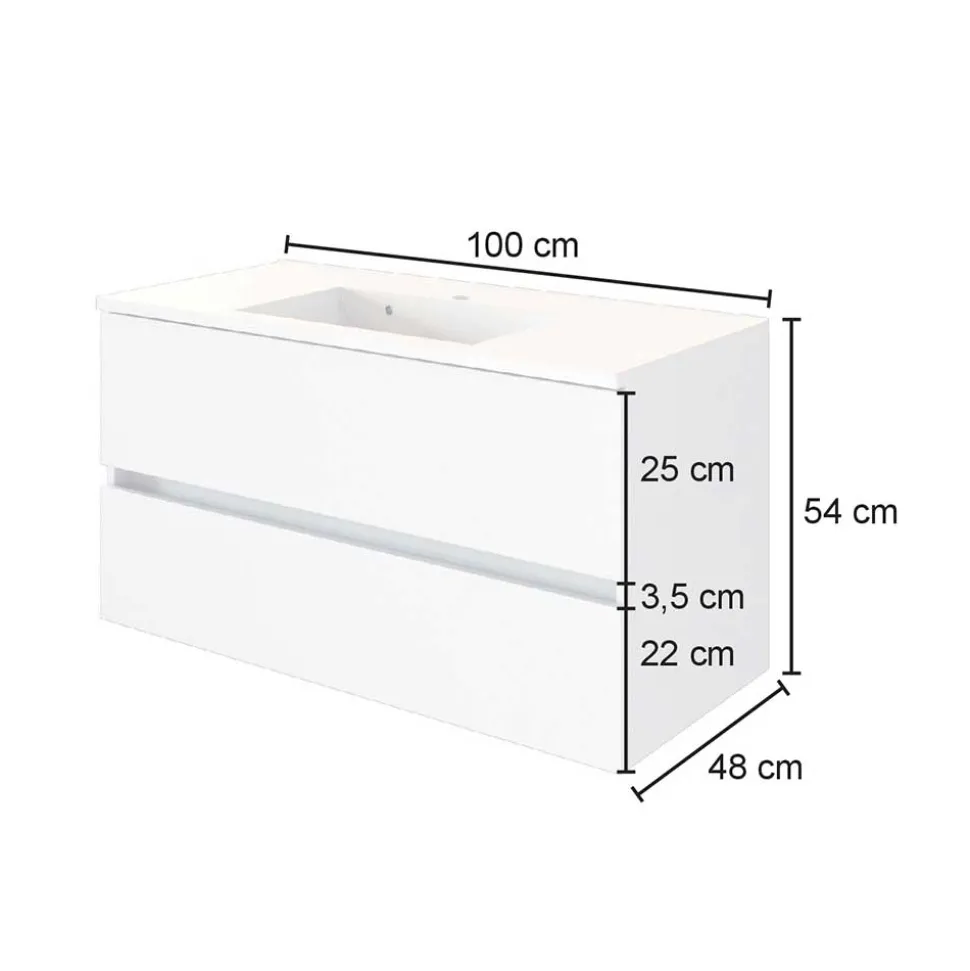 Mit einer Höhe von 56 cm und einer Tiefe von 47 cm passt sich der Waschtisch ideal auch in kleinere Bäder ein. Drei verschiedene Breiten – 60 cm, 80 cm und 100 cm – stehen zur Auswahl, je nach Platzangebot und individuellem Bedarf. Das pflegeleichte Mineralgussbecken in elegantem Weiß ist bereits im Lieferumfang enthalten. Es überzeugt durch seine porenfreie, glatte Oberfläche, die besonders hygienisch ist, sich einfach reinigen lässt und auch nach Jahren noch wie neu aussieht. Das Loch zur Montage Ihrer Wunscharmatur ist bereits vorgefertigt – Sie müssen nur noch anschließen.
