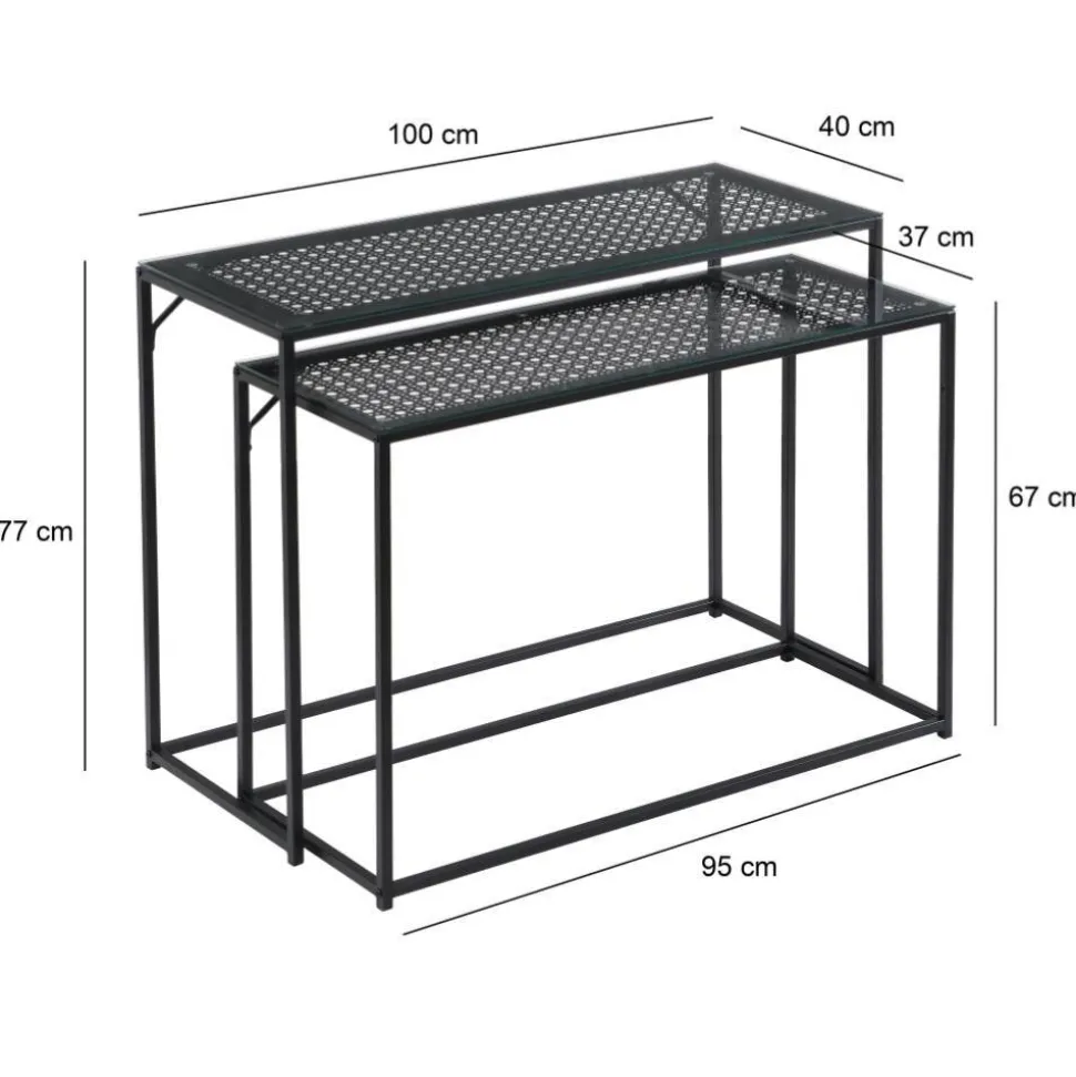 Gefertigt aus robustem Metall und transparentem Sicherheitsglas, vereint das Set Langlebigkeit mit ästhetischer Leichtigkeit. Die schwarze Lackierung der Metalloberflächen verleiht den Tischen eine elegante Tiefe und ist zugleich pflegeleicht sowie widerstandsfähig. Unter den Glasplatten zeigt sich ein faszinierendes Detail: dekorativ gelochte Metallflächen, deren feines Muster aus kleinen runden und größeren sechseckigen Öffnungen besteht – ein subtiler Verweis auf die industrielle Formsprache, die dem Ensemble seine besondere Note gibt.