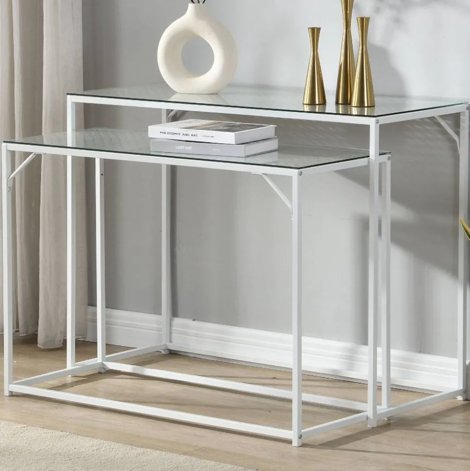 Mit dem Konsolentisch-Set Duo „Marian“ holen Sie sich gleich zwei formschöne Hingucker in Ihr Zuhause. Das puristische Design mit klaren Linien und der harmonischen Farbgebung in Weiß und Transparent sorgt für Leichtigkeit und moderne Eleganz. Ob im Flur, im Wohnzimmer oder im Schlafbereich – die beiden Tische passen sich mühelos jedem Raumkonzept an und wirken stets freundlich und unaufdringlich. Besonders praktisch: Der kleinere Tisch lässt sich einfach unter den größeren schieben – ideal, wenn Sie einmal mehr Platz benötigen oder Wert auf flexible Einrichtungslösungen legen.